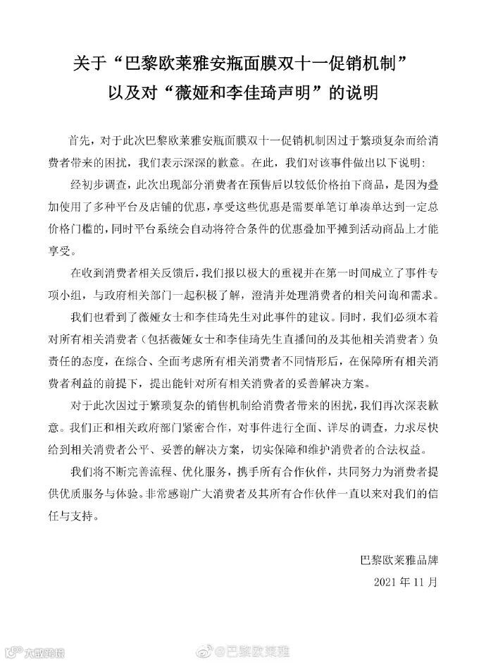 11月18日凌晨,巴黎欧莱雅在官方微博发布声明,对双十一预售差价一事致歉并表示已成立事件专项小组,将在综合、全面考虑所有相关消费者不同情形后,在保障所有相关消费者利益的前提下,提出能针对所有相关消费者的妥善解决方案。