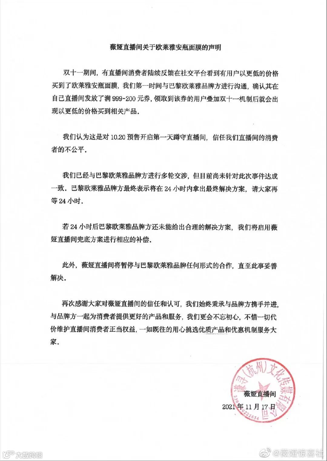 与此同时,在此事得到妥善解决之前,李佳琦直播间和薇娅直播间将暂停与巴黎欧莱雅官方旗舰店的一切合作。