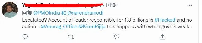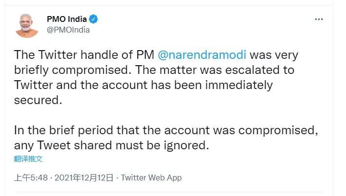 “总理莫迪的个人推特账号遭受了很短暂的入侵。此事已经升级到了推特公司,随后账号立即得到了保护。在被入侵的短暂时间内,分享的所有推文都要被忽略。”