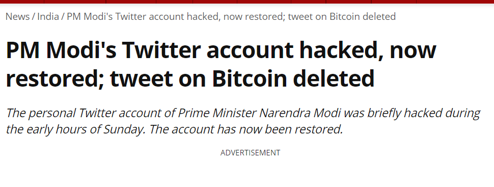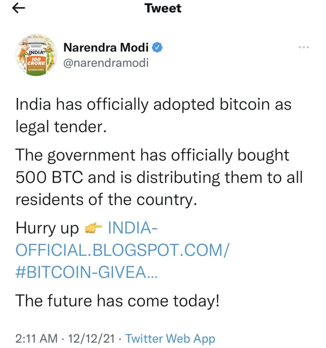 Indian Prime Minister Narendra Modi's personal Twitter account was "briefly compromised", his office posted on the social networking site early on Sunday morning, after it shared a scam link promising a bitcoin giveaway.