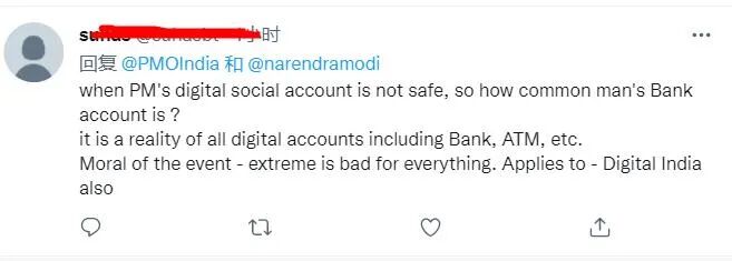 “这是一个非常严肃的事情,你们只是说被短暂的入侵,而不是说对推特采取了强硬行动。如果穆迪个人的账号都不安全,那普通印度民众的安全呢?”