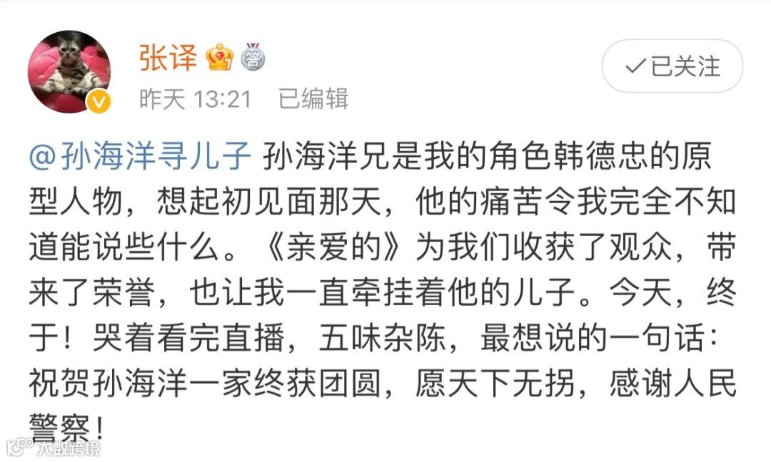 12月6日,演员张译发文祝福《亲爱的》中自己扮演的角色原型人物孙海洋找到儿子,“今天,终于!哭着看完直播,五味杂陈,最想说的一句话:祝贺孙海洋一家终获团圆,愿天下无拐,感谢人民警察!”《亲爱的》片方也发布新海报送上祝福:“亲爱的小孩终回家”。