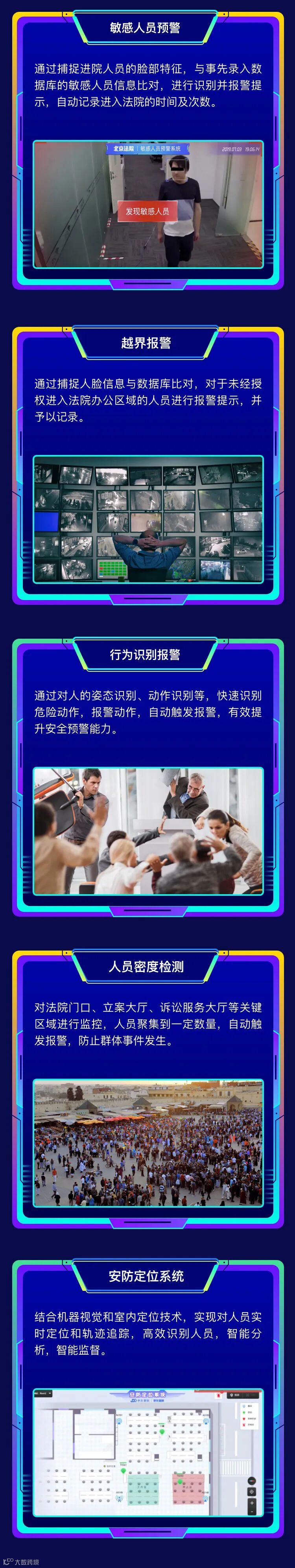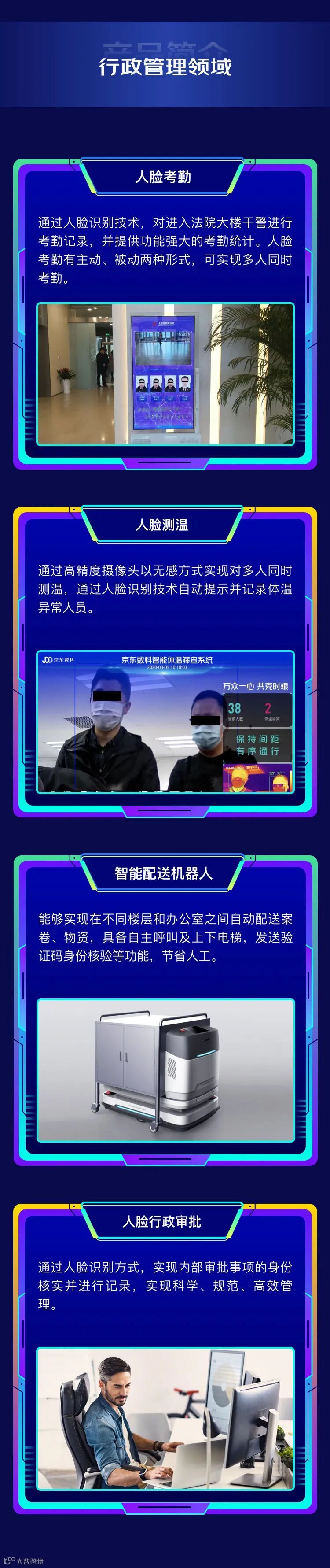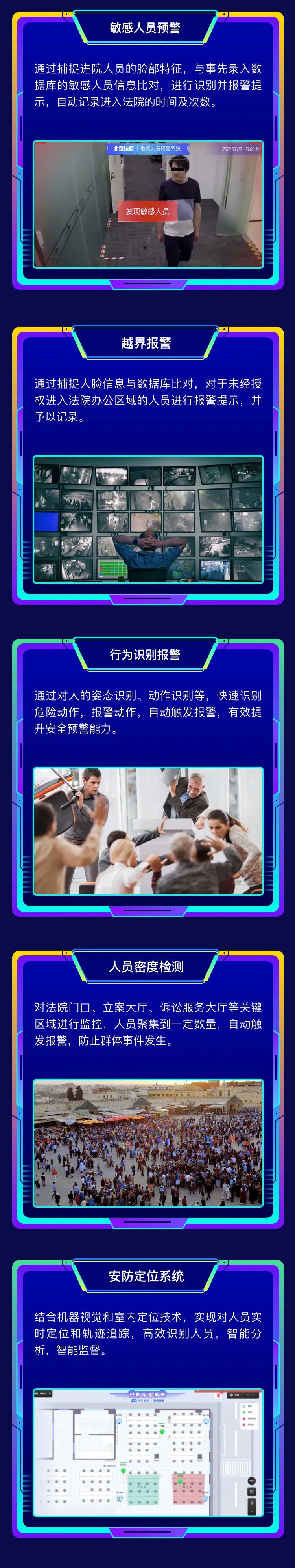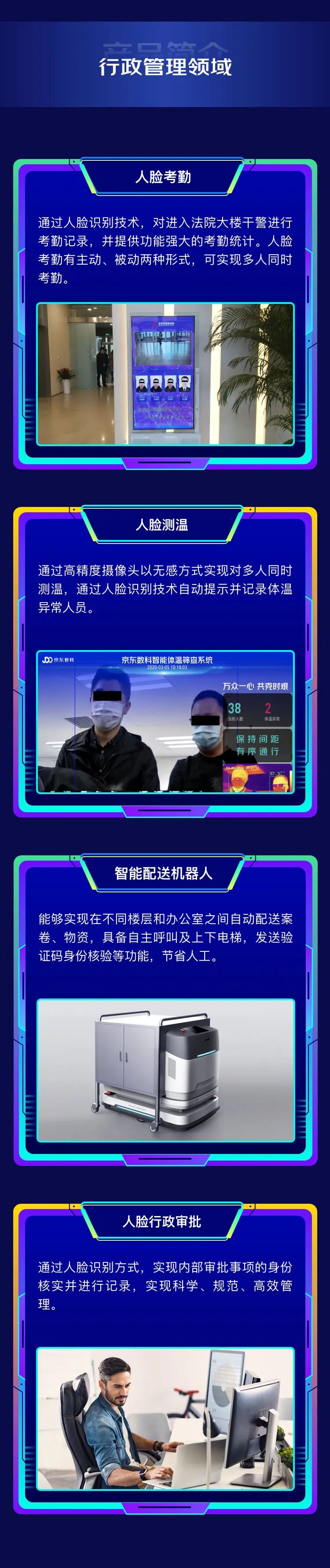 在安保领域,我们在法院中增加了人证核验闸机、刷脸门禁和人证核验一体机。通过京东数科自主研发的毫秒级人脸对比技术,既可以实现对持证人、身份证和律师证一致性的自主核验,还可以与中控系统对接,对不同区域开放不同人员的进出管理权限。在安全预警方面,京东数科结合机器视觉和室内定位技术,可实现对人员实时定位追踪和智能识别分析,如遇到危机事件,可进行敏感人员预警、越界报警、行为识别报警,有效提升安全预警能力。还有室内卷宗运送机器人,能够自动往返于立案窗口和材料收转窗口之间,卷宗柜上设密码锁,保证卷宗取送安全。机器人可以自动规划路线,遇到行人和移动障碍物会主动绕障。