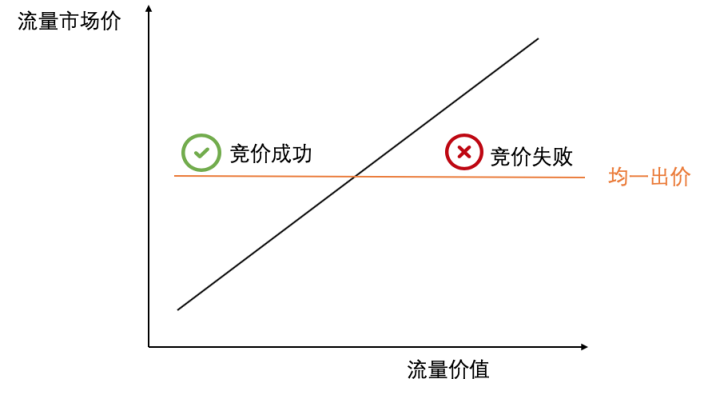 流量的市场价是由参与竞价的广告主决定的,流量的市场价与流量价值(流量为广告主带来的收益)成正比。试想一下,如果我们对所有用户都按市场平均价出价,会获得什么样的流量呢?答案是容易获得低价值的流量。因为对于高价值流量,我们的出价不具有竞争力。当我们对流量价值预估不准时,我们把不同价值的流量放在一起出价,依然会出现高价值流量竞争力不足的问题。在竞争激烈、出价接近用户价值的情况下,这个问题可能导致广告主的亏损!