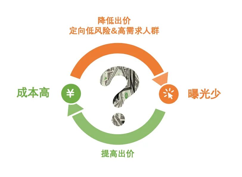 小A发现互金产品的借贷成本(新增一次借贷需要的广告投入)太高,于是他分别通过降低出价、定向低风险和高需求用户进行后续的竞价。然而,虽然投放的成本降低了,但是产品的曝光量却急剧减少(广告的展示次数)。于是,小A通过提高出价和放宽人群定向限制来增加广告曝光量,但这样又导致了成本超标和人群质量较低的问题。