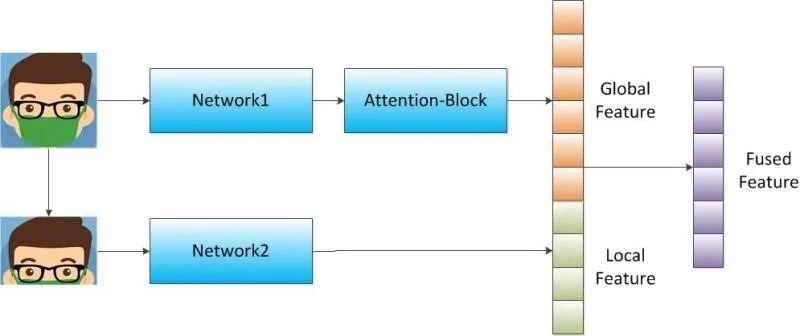 在算法层面,引入注意力机制,加大鼻部以上特征的训练权重,使模型更加关注非遮挡人脸区域,尽可能地降低各种样式口罩带来的干扰,此外,还显示引入局部人脸区域提取人脸特征,融合到全局人脸特征。
