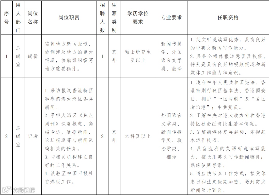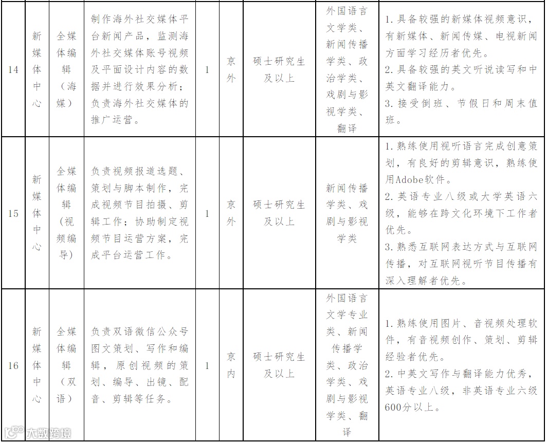 二、变更部分岗位有关资格条件。《中国日报社2022年公开招聘工作人员公告》中,序号1、2、4、5、6、14、16岗位专业要求中增加“翻译”;序号15岗位“全媒体编辑(视频编导)”,语言能力要求由“英语专业八级,非英语专业六级600分以上”变更为“英语专业八级或大学英语六级”。
