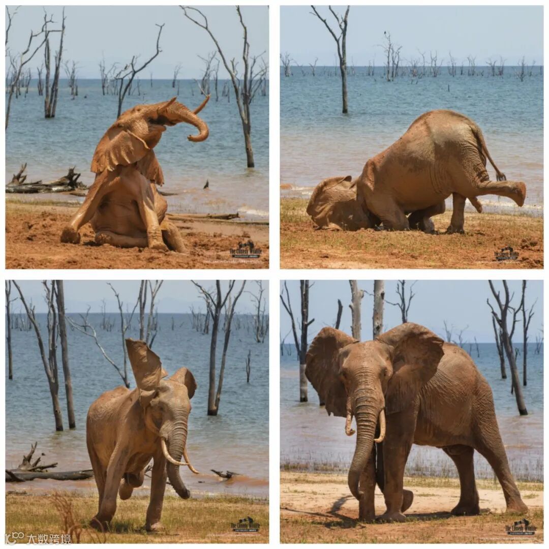 一只小象在泥地里玩得正欢,一不小心摔了个“象啃泥”。