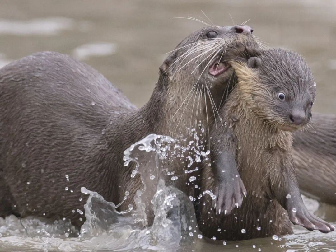 水獭妈妈把水獭宝宝叼来叼去,让它学游泳。