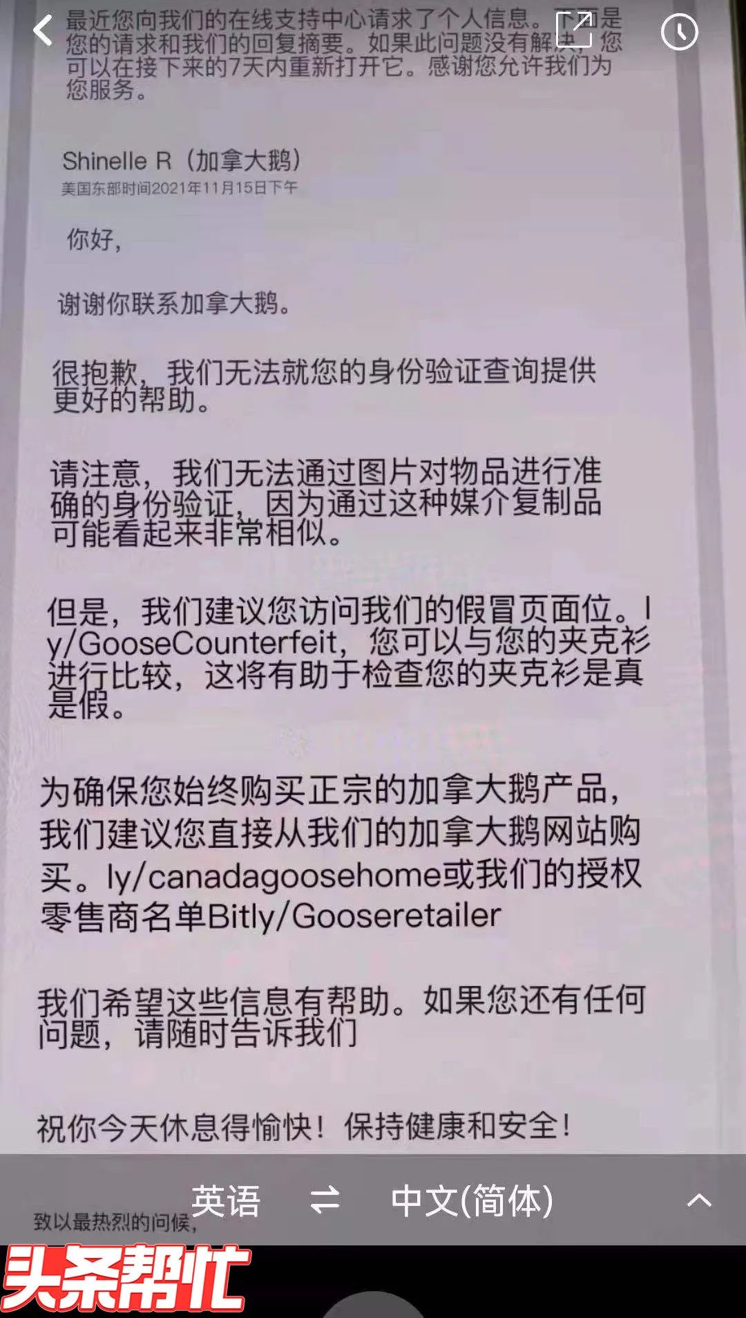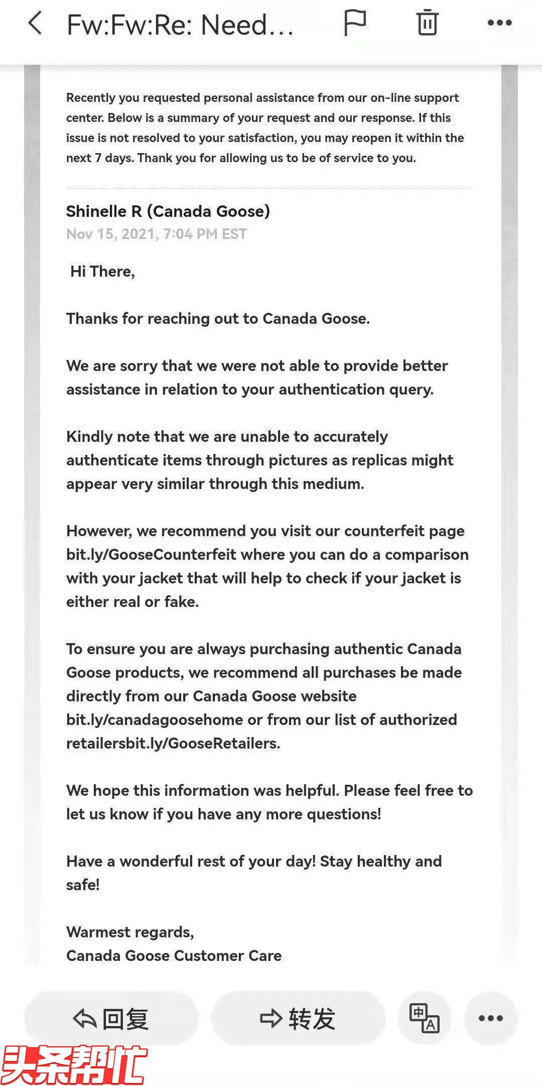 加拿大鹅总公司给消费者的回复邮件(中文翻译版)