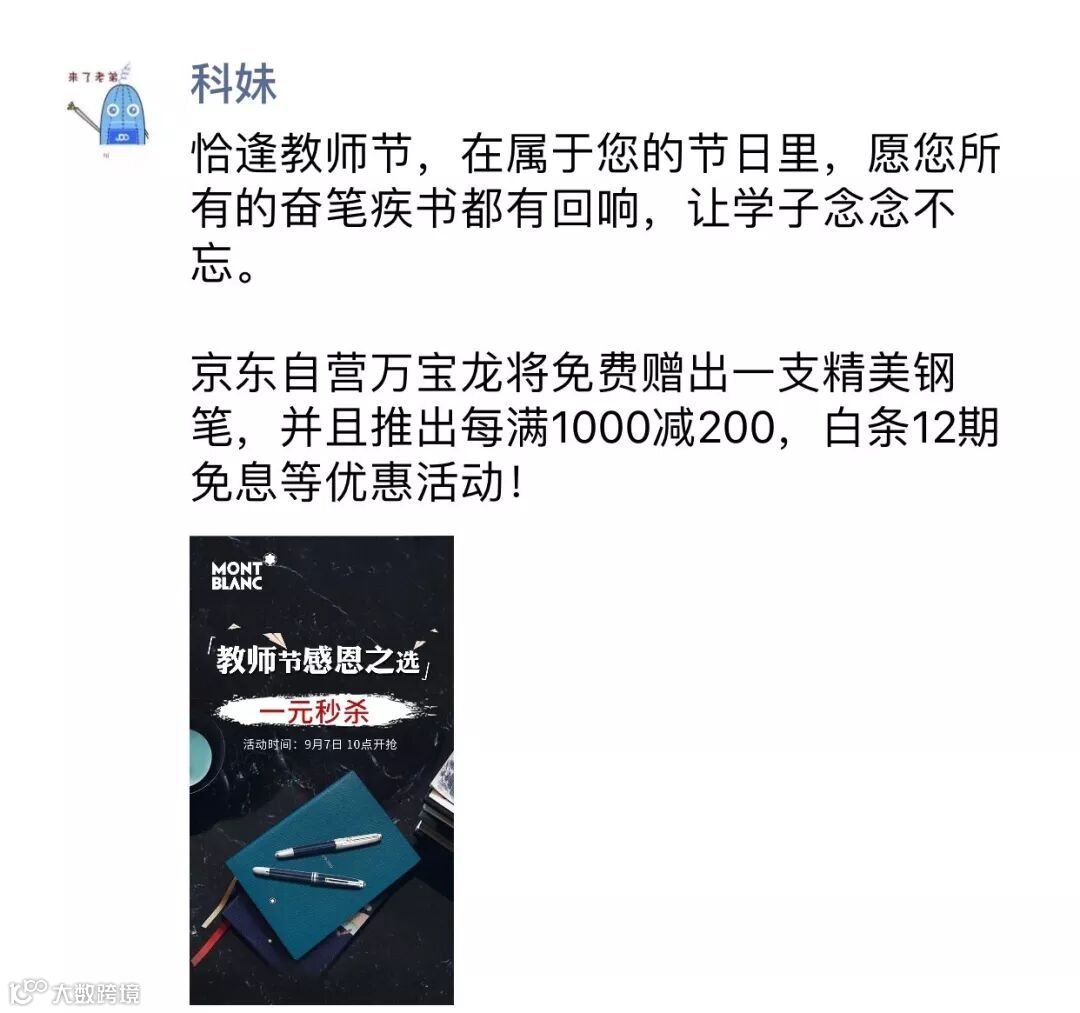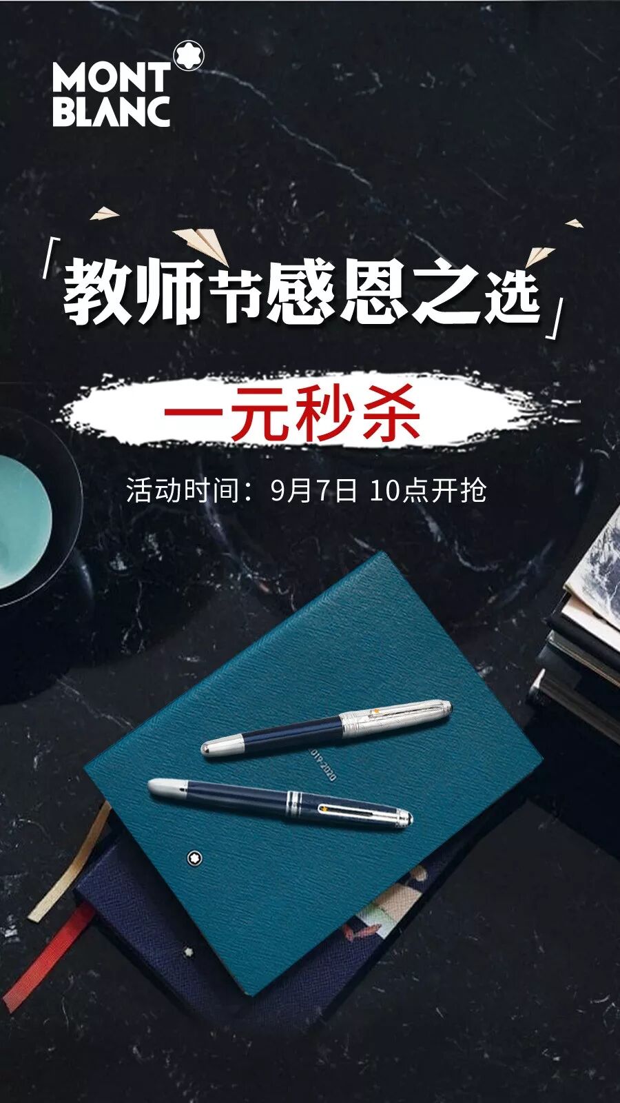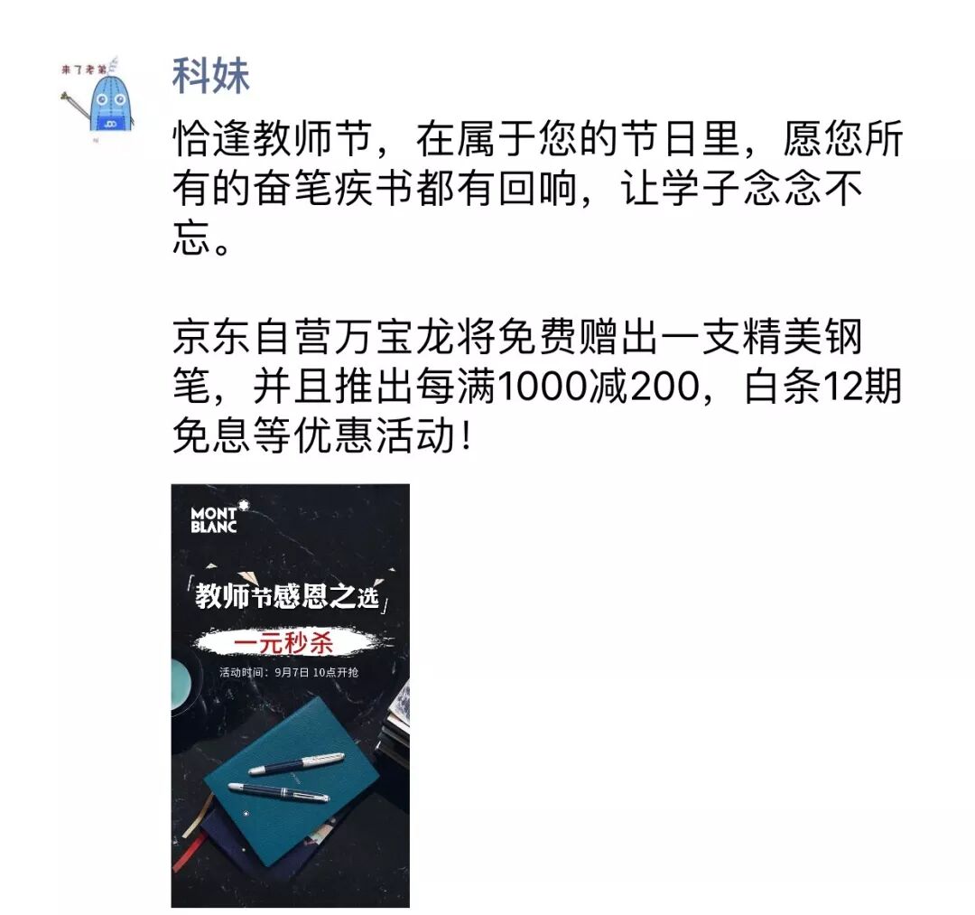 每个人学生时代都曾遇见过一位改变你人生的老师,他们并非辛苦到每天都在披星戴月地批改作业,却用手中的一支笔传递着最真实的道理,愿所有的奋笔疾书都有回响,让学子念念不忘。恰逢教师节,万宝龙也愿作您手上握着那支最厚重的笔,继续书写出最优美、最灵动的“痕迹”。京东自营万宝龙店推出每满1000减200,白条6期免息活动。9月7日-9月9日更有每天定时1元秒杀活动,买一支钢笔,携几位老友,回学校看看老师吧~