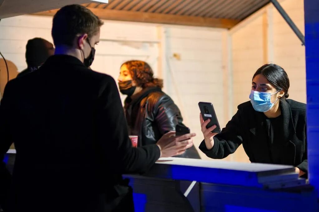11月26日,工作人员(右一)在比利时布鲁塞尔的圣诞市场查验游客的健康通行证。图源:新华社