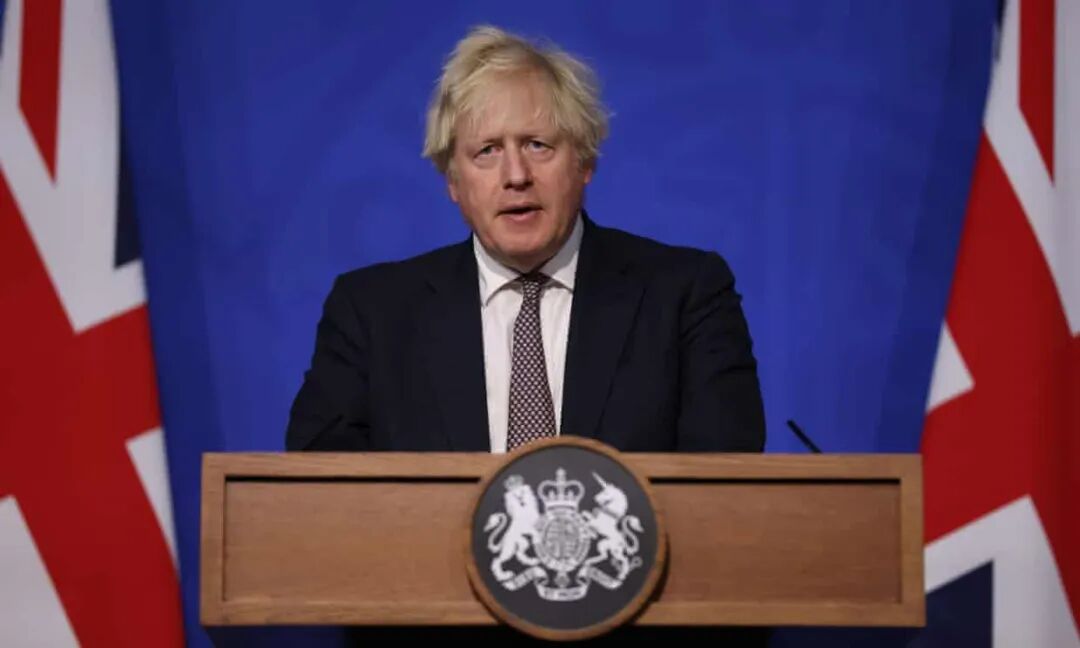 当地时间11月27日,英国首相鲍里斯·约翰逊召开记者会,宣布英国应对新型变异毒株措施。图源:卫报