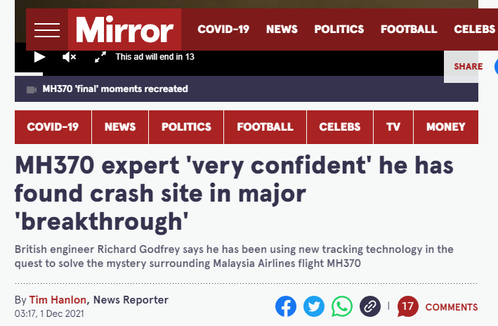 根据戈弗雷的报告,MH370在失联当天最后一次与卫星连接后约一分钟内在印度洋上空坠毁。戈弗雷认为飞机落在断脊(Broken Bridge)的底部,水下地形非常复杂。“那里有不少裸露的山峦和悬崖,一座水下火山和一个峡谷。”