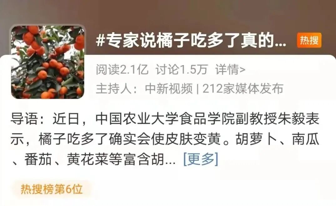 中国农业大学食品学院副教授朱毅表示,橘子吃多确实会使皮肤变黄,这种现象也叫“高胡萝卜素血症”或“柑皮症(hypercarotenemia)”。