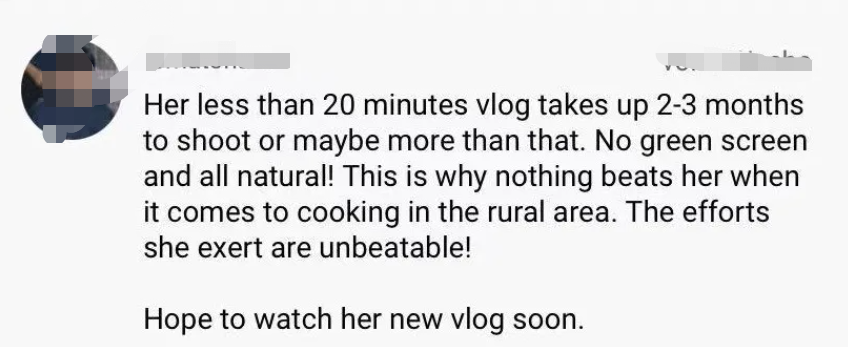 “她不到20分钟的视频要花2-3个月,甚至更长的时间来拍摄。没有绿幕,全都是自然场景!这就是为什么在田园烹饪这个领域她是无敌的。她所花费的心血无人能及!希望能很快看到她的新视频。”