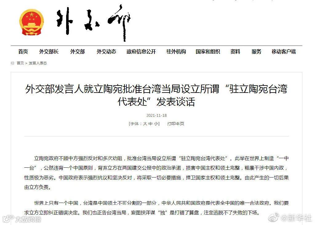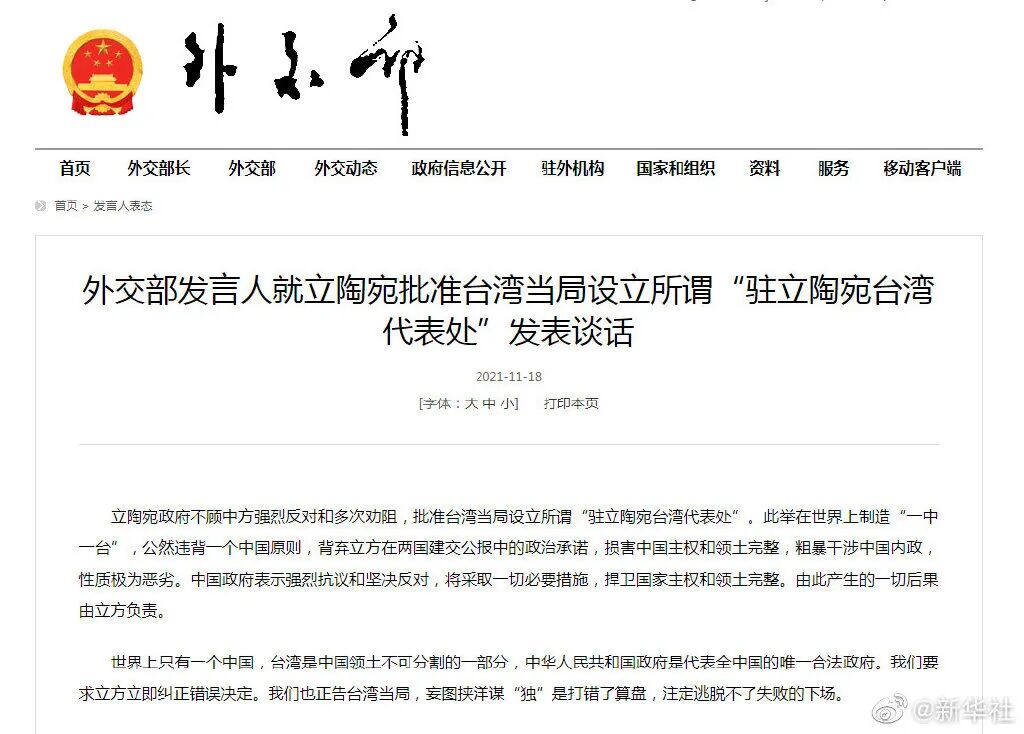 立陶宛政府不顾中方强烈反对和多次劝阻,批准台湾当局设立所谓“驻立陶宛台湾代表处”。此举在世界上制造“一中一台”,公然违背一个中国原则,背弃立方在两国建交公报中的政治承诺,损害中国主权和领土完整,粗暴干涉中国内政,性质极为恶劣。中国政府表示强烈抗议和坚决反对,将采取一切必要措施,捍卫国家主权和领土完整。由此产生的一切后果由立方负责。
