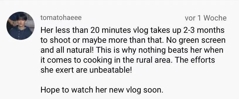她不到20分钟的视频,拍摄时间要用2-3个月,甚至更长。 没有绿幕拍摄,全是自然的!这就是为什么在乡村烹饪上她是无敌的。 她付出的努力是无与伦比的!