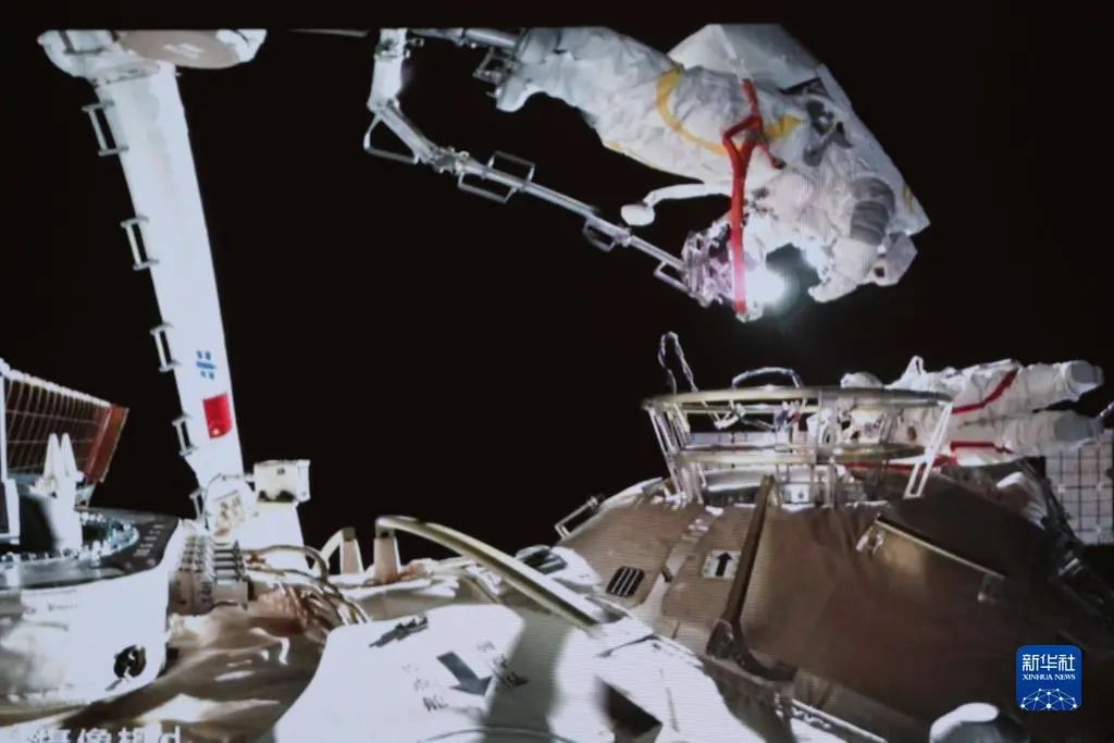 这是11月7日在北京航天飞行控制中心拍摄的神舟十三号航天员翟志刚、王亚平同时在舱外操作的场景 图源:新华社