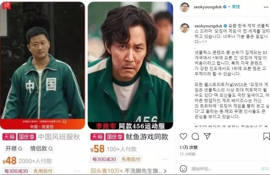 Xu Gyeongde said in the post: "In shopping apps, unauthorized use of Lee Jung jae's photos to sell the green sportswear famous for TV dramas is wrong." Xu continued to promote his biased remarks towards China, claiming that "(China) has plagiarized too much Korean content... They said Kimchi, Samgyetang, Hanbok, etc. originate from China."
