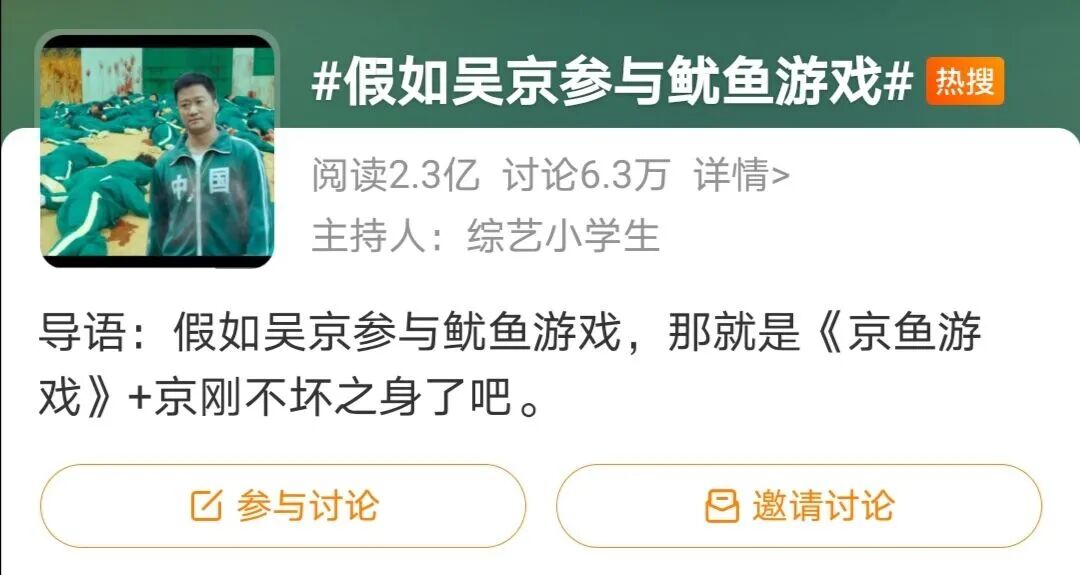 Some netizens put Wu Jing meme into Squid Game spoof, and the related topic "If Wu Jing participated in the game of squid" appeared in the hot search on Weibo.