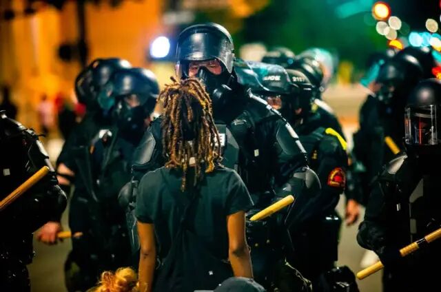 这里,警察穿的制服被称作uniform of domestic war, 照字面翻译就是内战制服。这个说法的背后其实有讲究:它源于美国国防部的一项计划(1033 项目), 此项目是专门授权美国国防部将多余的军事装备转让给非军事执法机构。当美国出现重大内乱时,国防部可以将一些军事装备分配给美国国内的警察(domestic police force)。这些装备原本是用在阿富汗和伊拉克战场上的,现在这用来攘外的家伙居然用来安内,难怪作者称这套警察身上的行头为 uniform of domestic war,内战的制服。