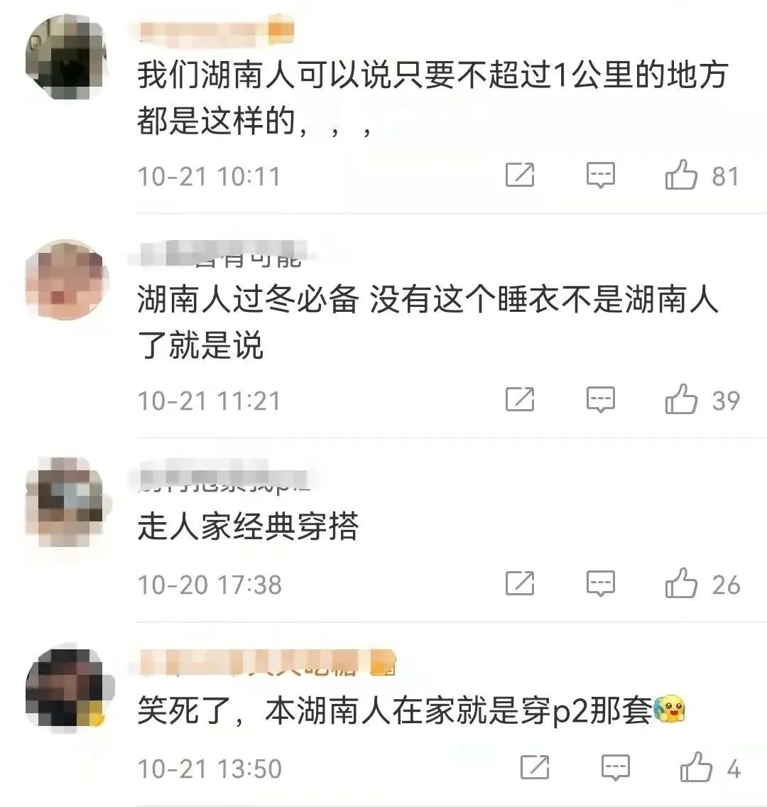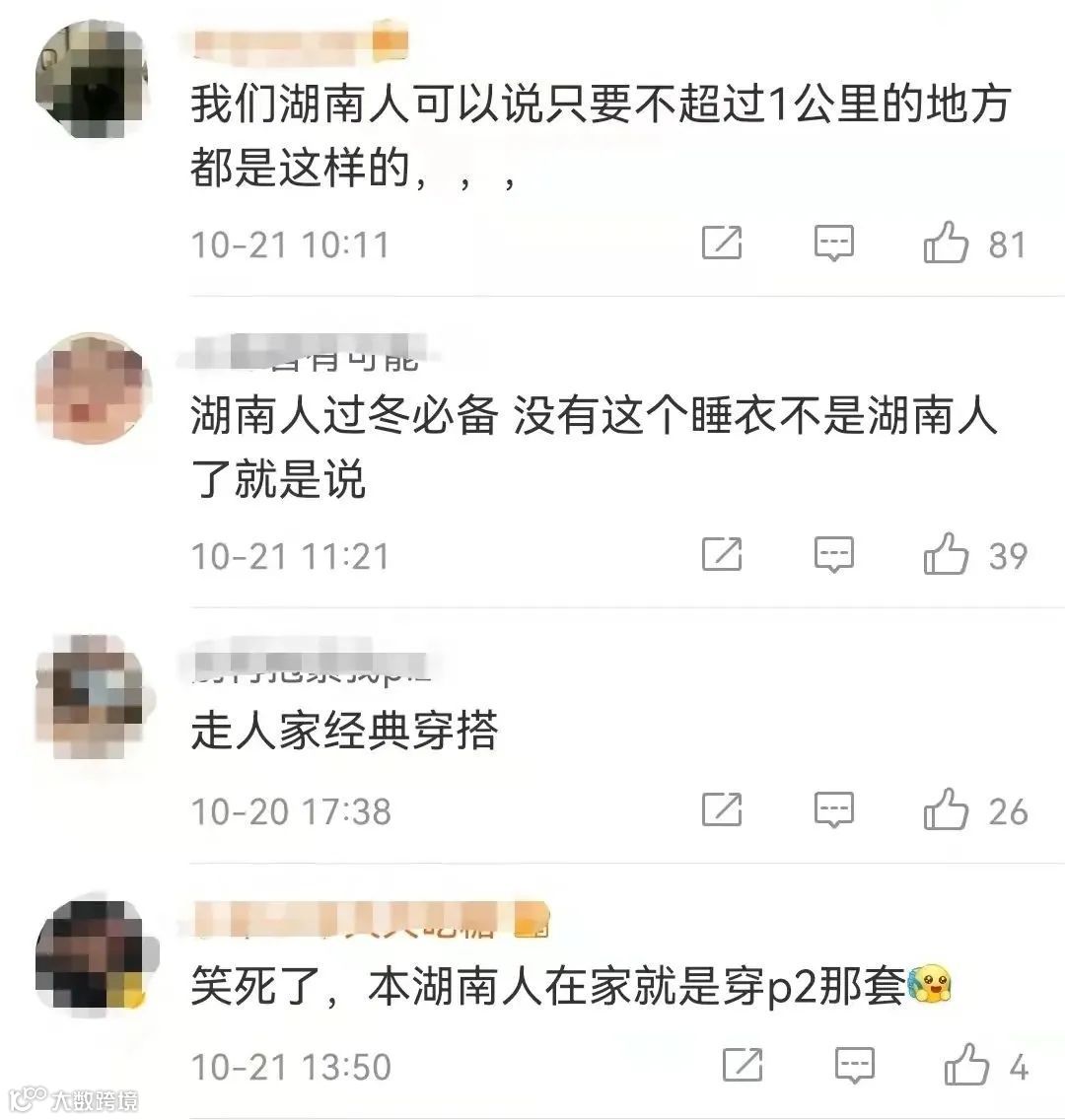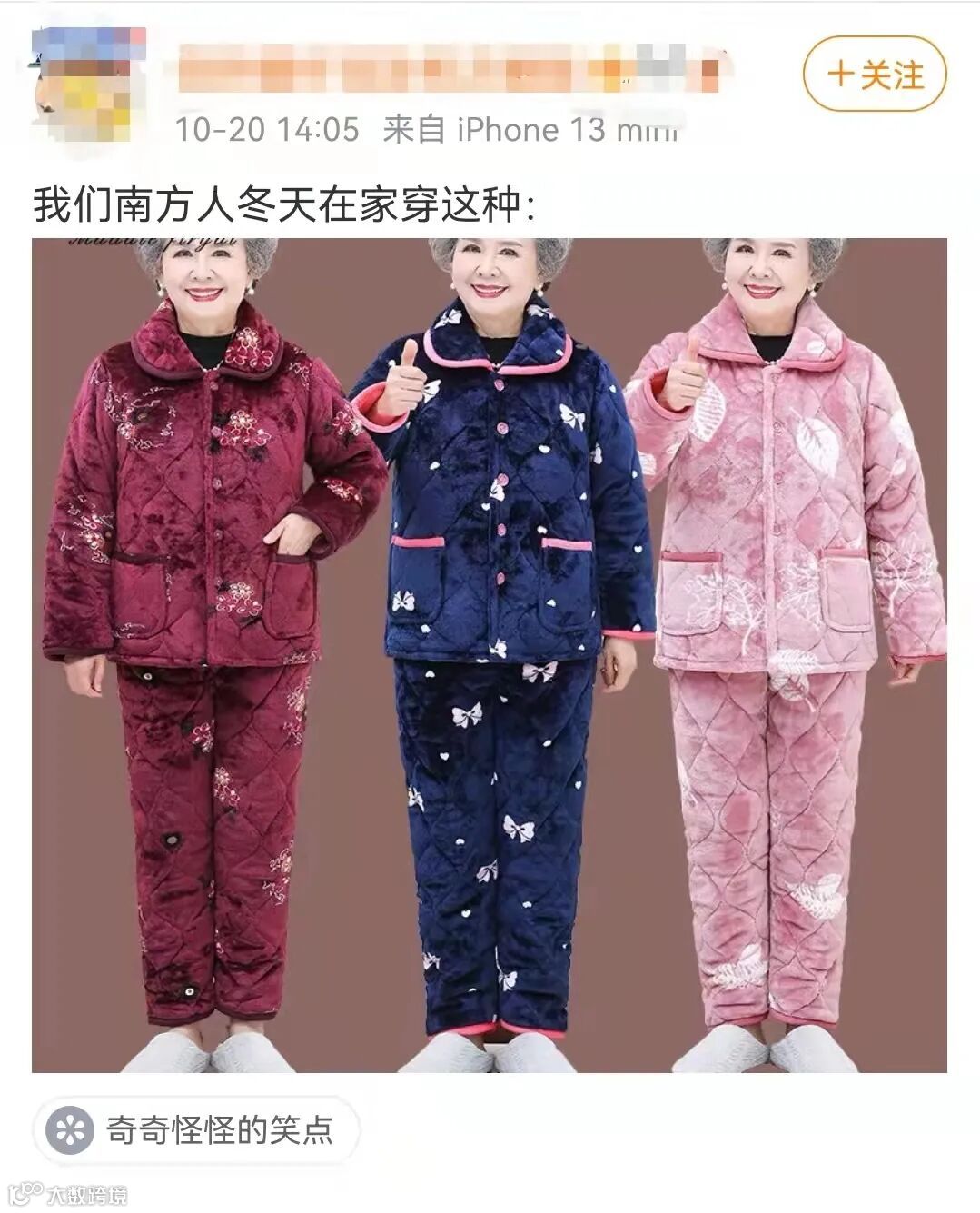 有网友在微博上发了一张大妈睡衣展示图,“我们南方人冬天在家穿这种”,立刻引发大批南方人共鸣……