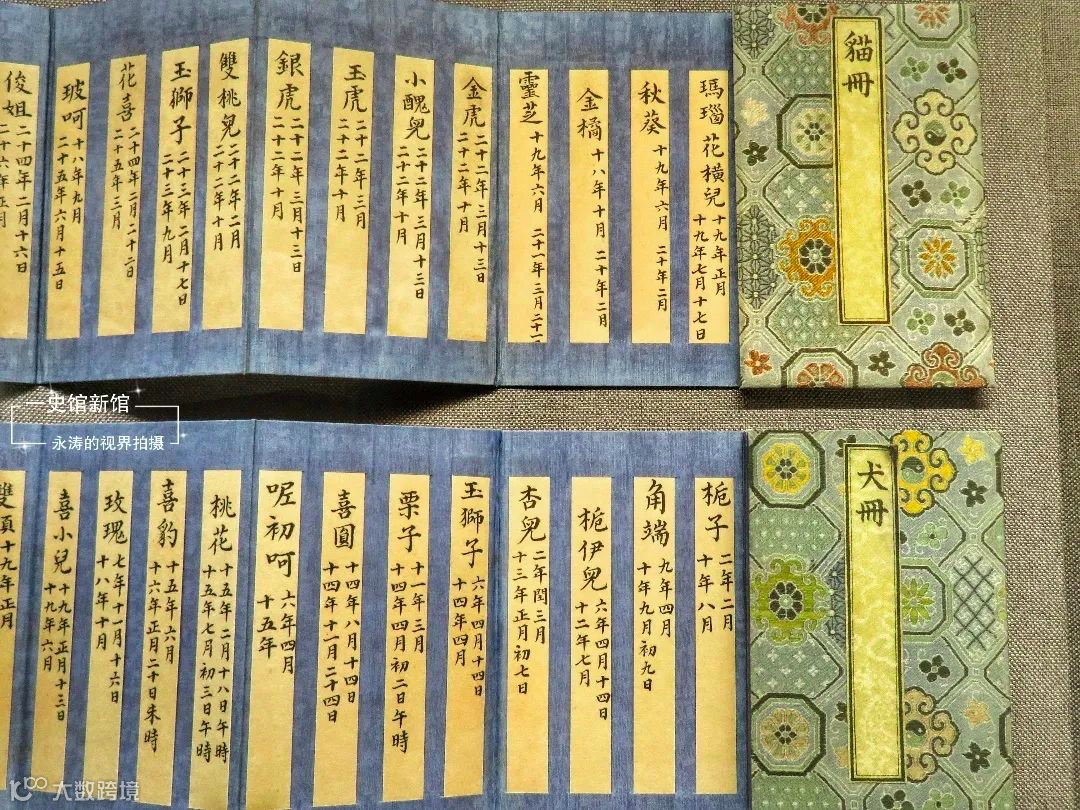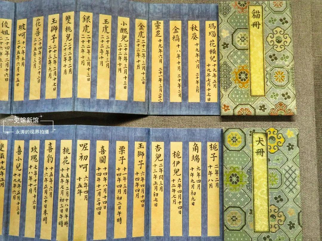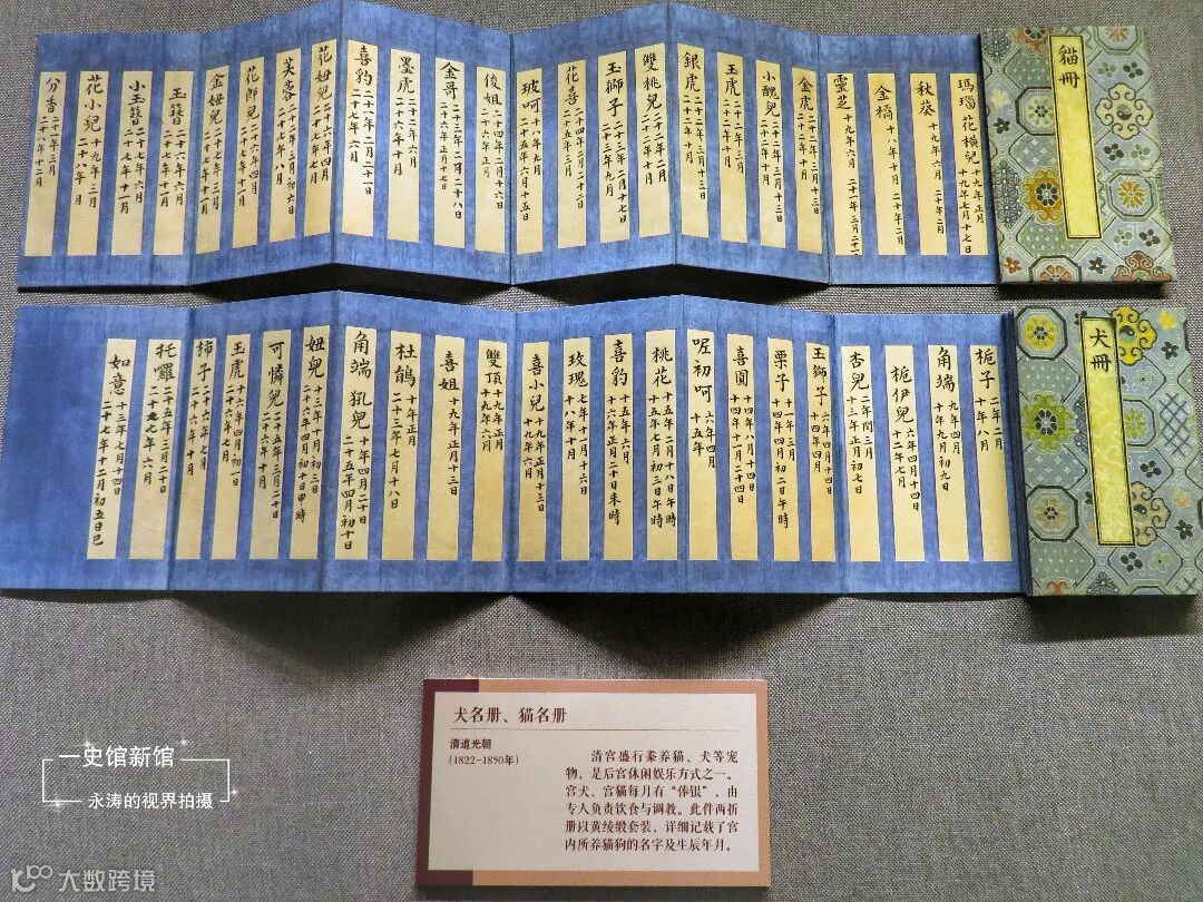 “清宫盛行豢养猫、犬等宠物,是后宫休闲娱乐方式之一。宫犬、宫猫每月有‘俸银’,由专人负责饮食与调教。此件两折册以黄绫缎套装,详细记载了道光朝宫内所养猫狗的名字及生辰年月。”