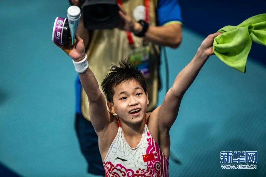9月12日,广东队选手全红婵在比赛后向观众微笑致意。新华社记者 陶亮 摄