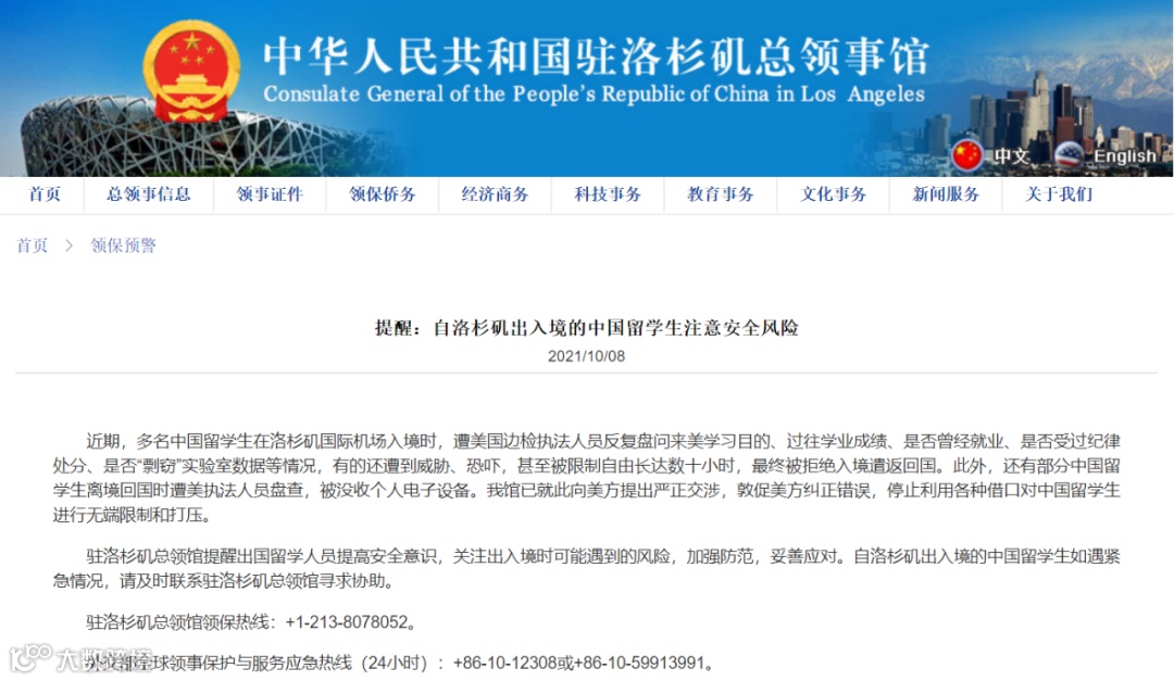 10月8日,中国驻洛杉矶总领事馆发布提醒,称近期多名中国留学生在洛杉矶国际机场入境时遇到重重阻碍。
