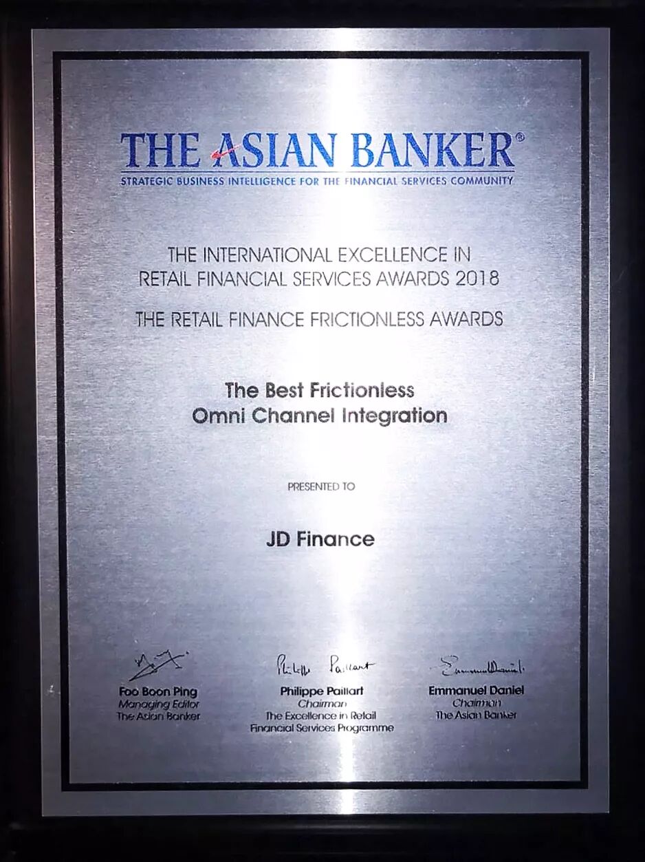 3月22日,京东金融被《亚洲银行家》授予2018年度国际卓越零售金融服务奖项之最佳全渠道整合奖(the Best Frictionless Omni Channel Integration),用以表彰京东金融通过白条、支付等代表性产品的全渠道拓展,为金融机构提供全面服务,推动全球零售金融发展方面做出的突出贡献。