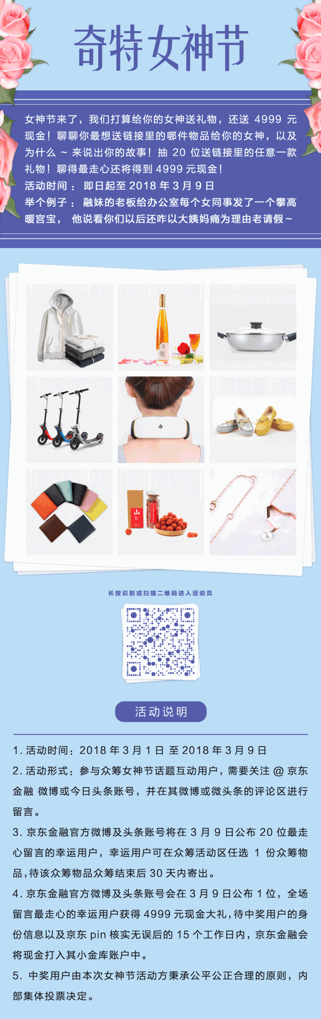 感谢这些大大小小的姑娘们,让我们生命中多了一束玫瑰色的柔光,世界因她们而更加柔软动人。这次女神节,京东金融拿出了20个京东众筹奇特礼物以及4999现金,打算送给其中最特别的姑娘们。