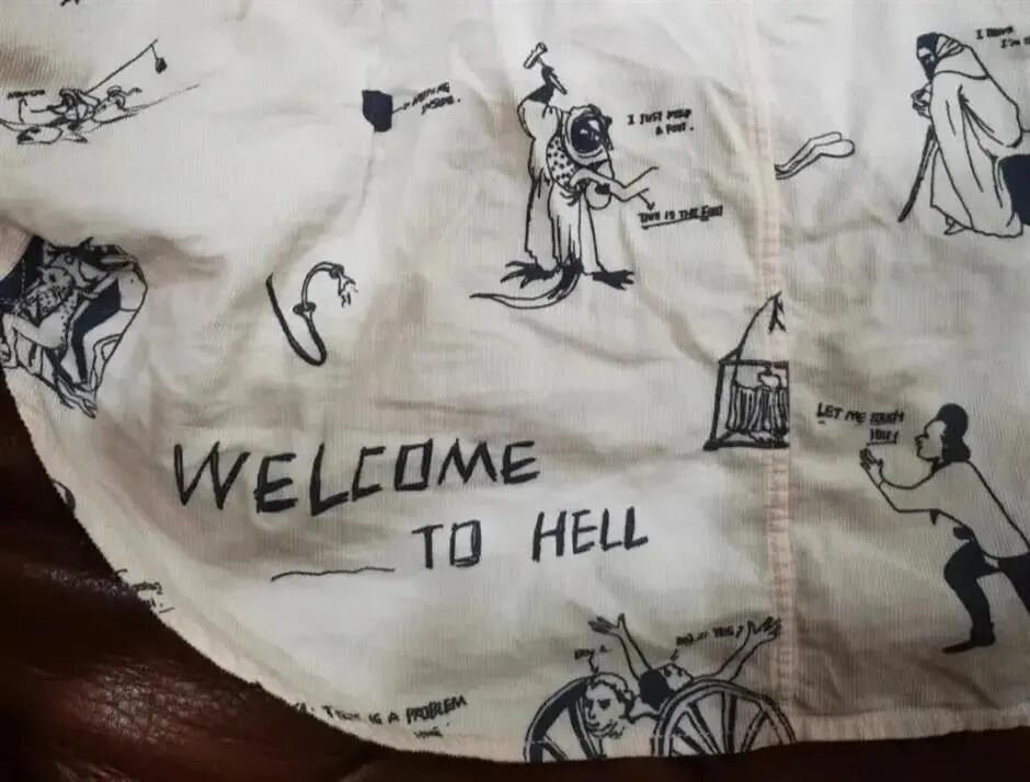 The clothes are printed with messages such as "Welcome to Hell" and "Let me touch you," as well as prints of a Satan-like figure chopping a leg, according to pictures posted by customers.