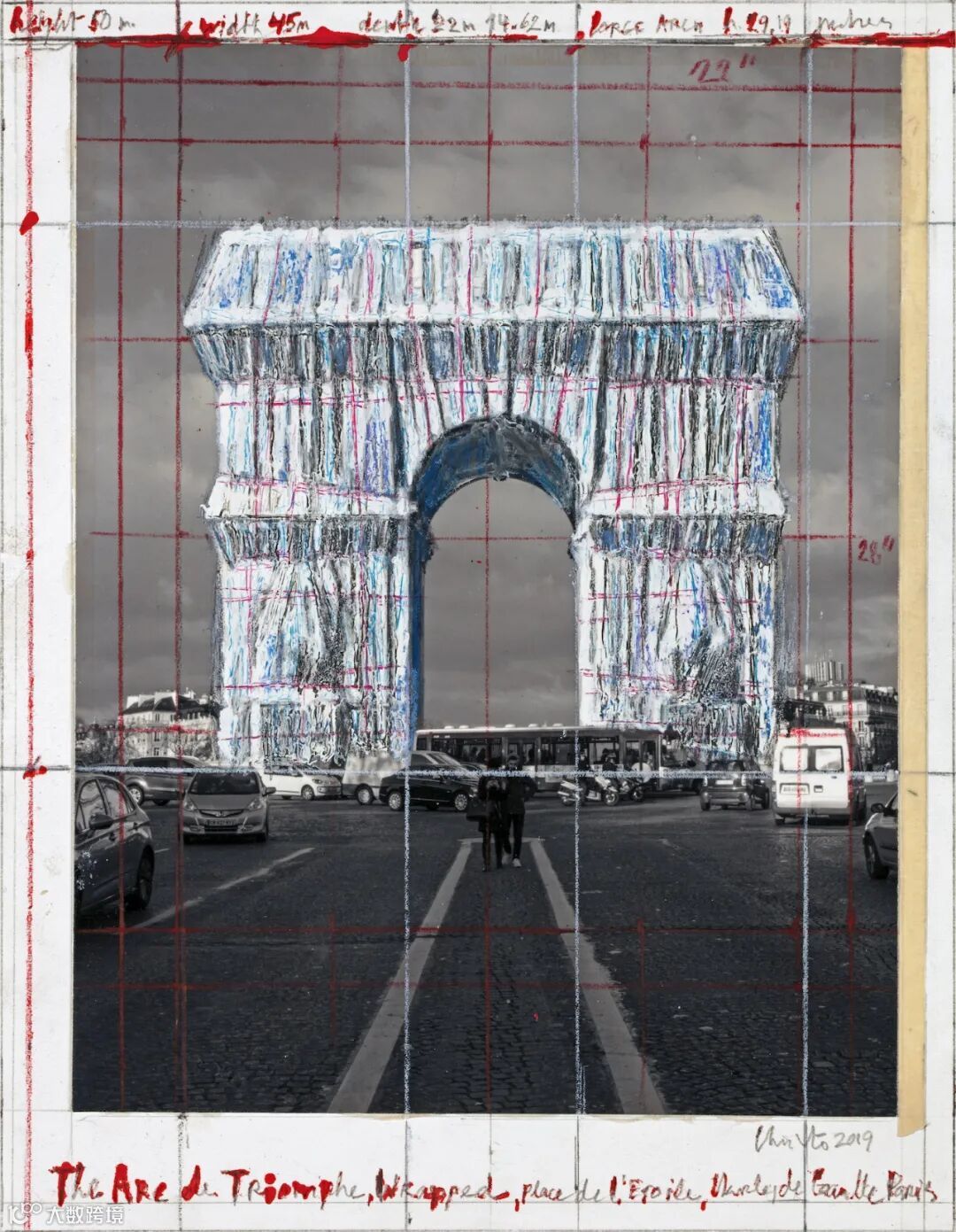 届时,凯旋门将被2.5万平方米的银蓝色可回收聚丙烯织物和3000米的红绳包裹。
