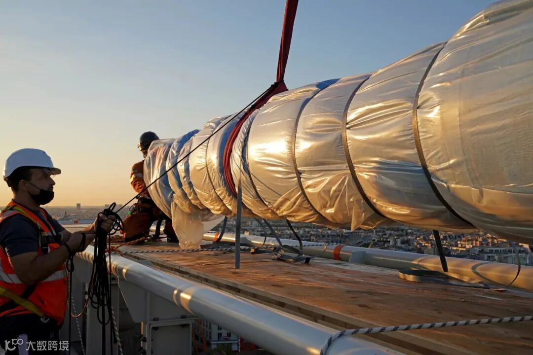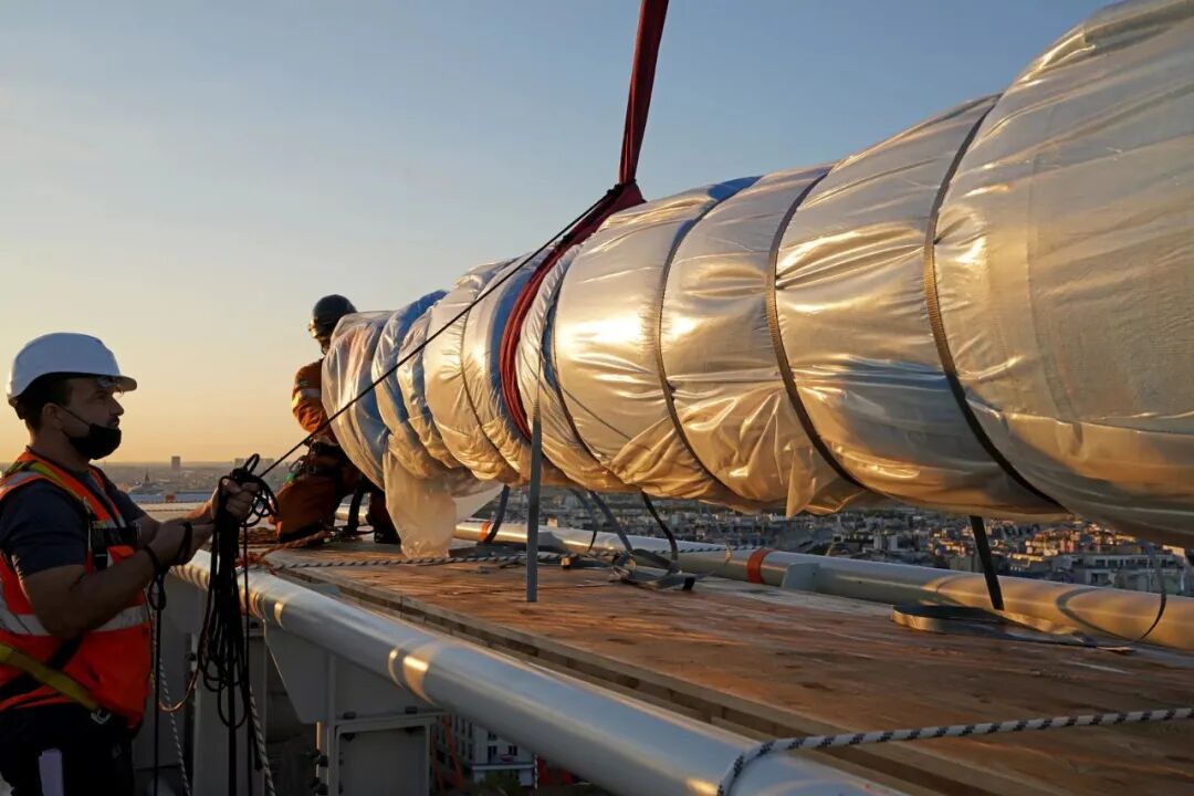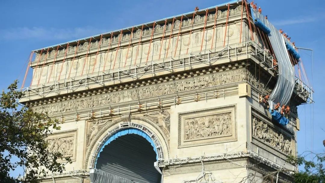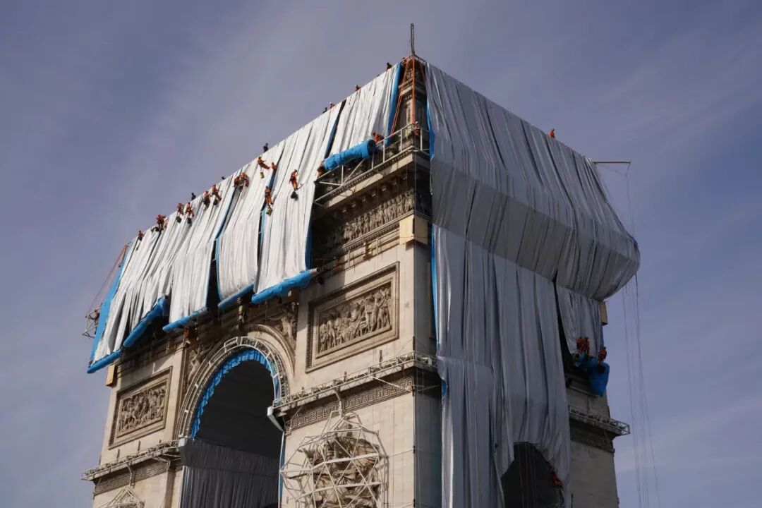太阳从巴黎市中心升起后不久,第一批穿着橙色衣服、绑着绳索的技术人员登上凯旋门的顶部,开始顺着绳索下滑,展开一条条在晨光中闪闪发光的银蓝色织物。
