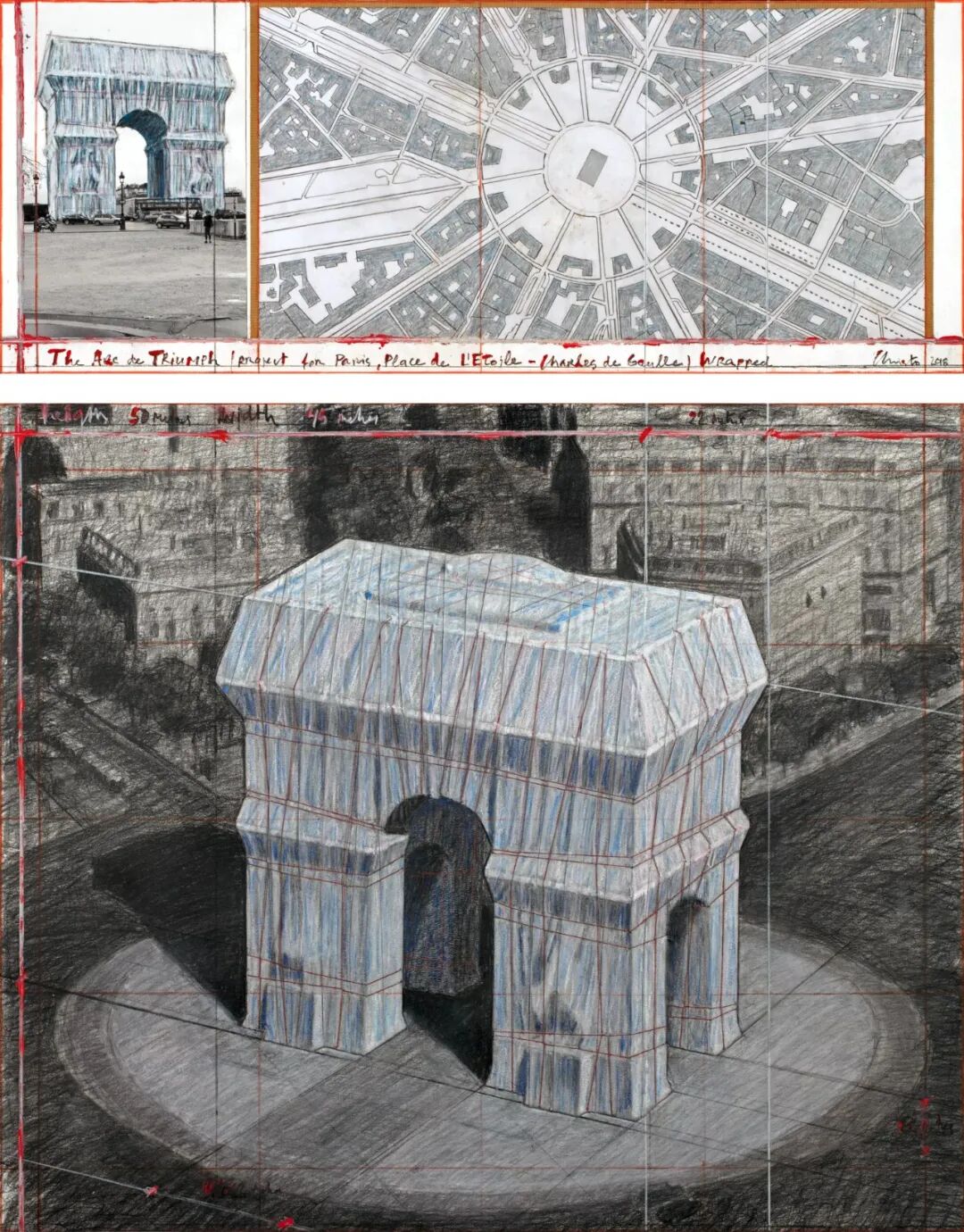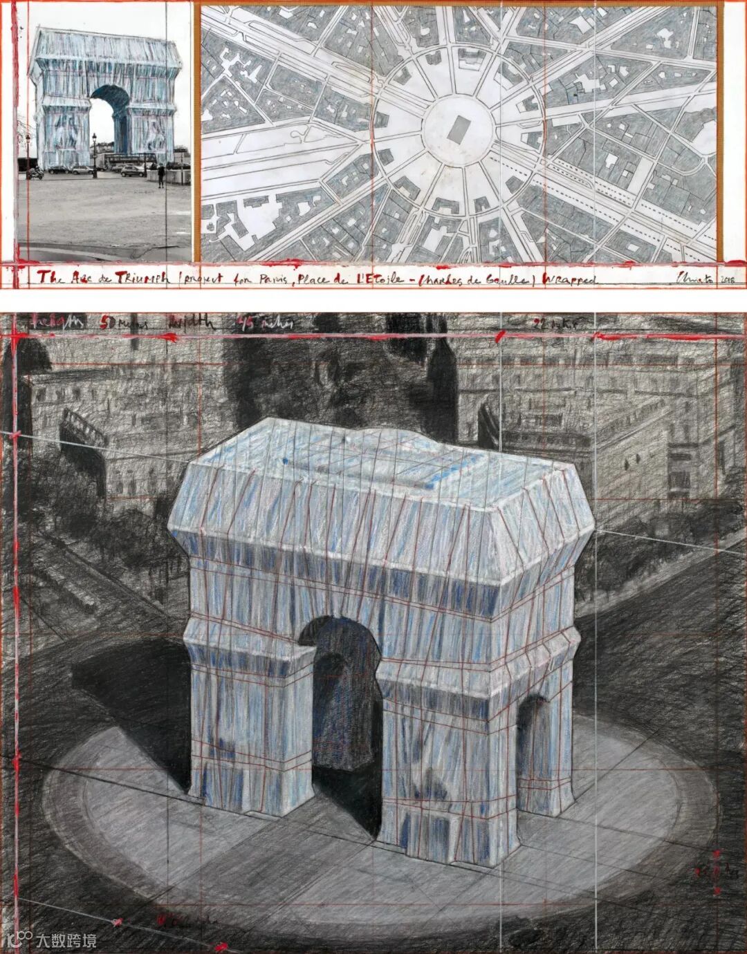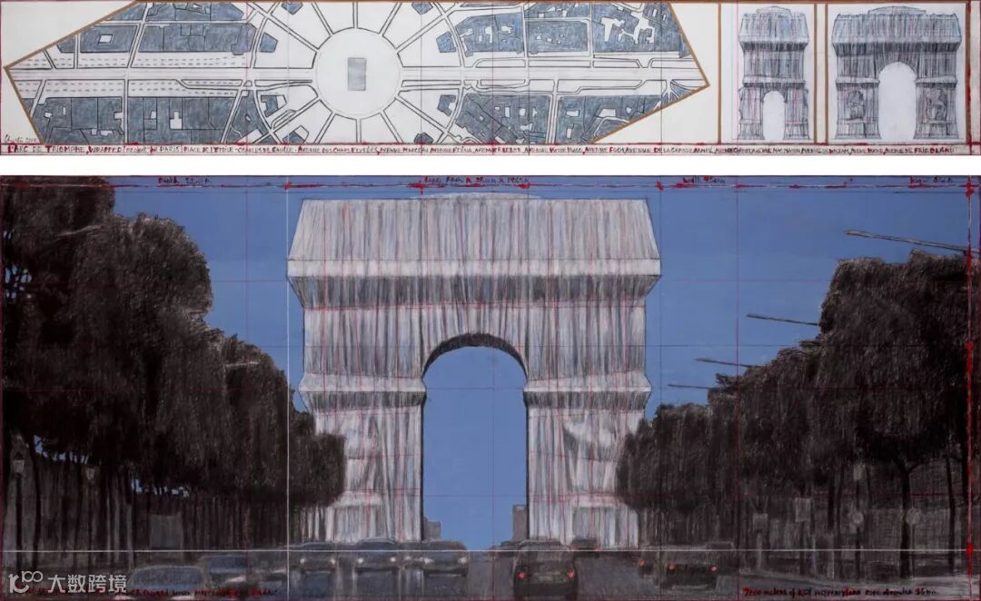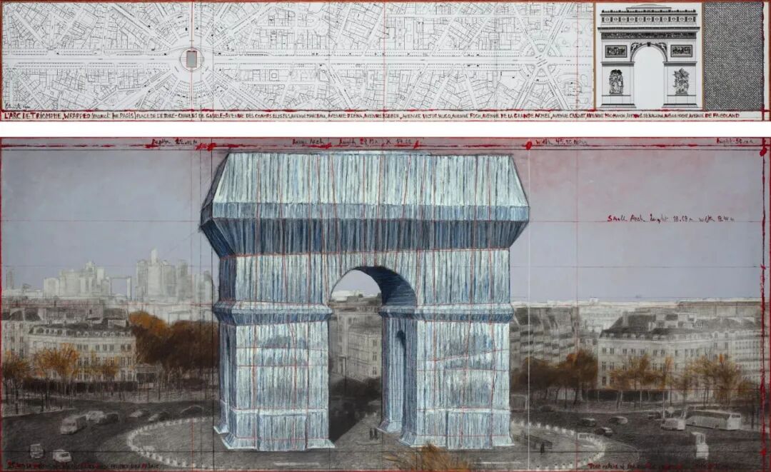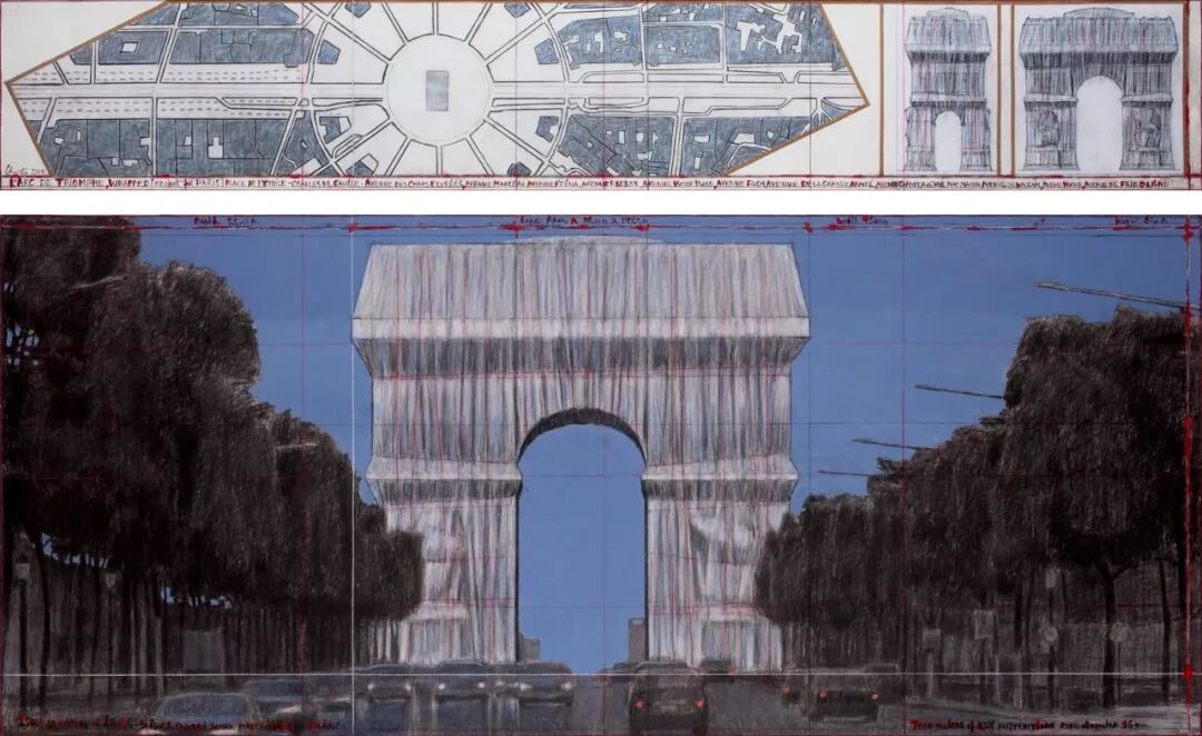 克里斯托为《包裹凯旋门》绘制的众多设计图 来源:Christo and Jeanne-Claude