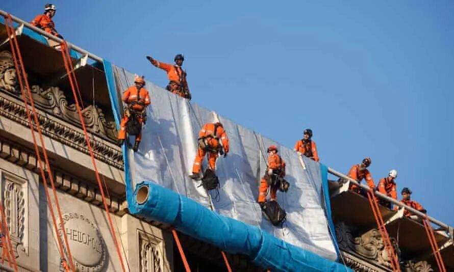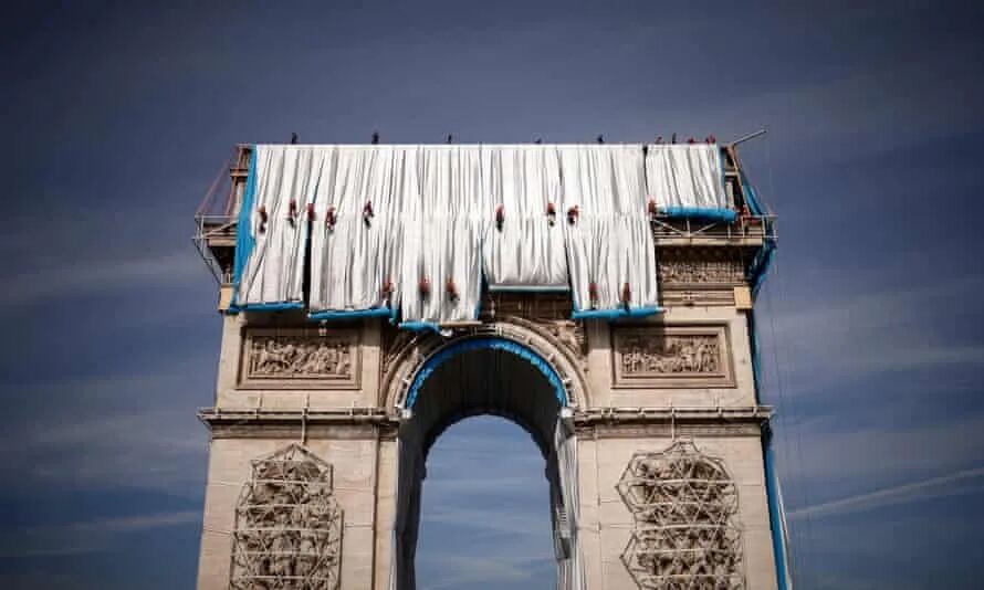Shortly after the sun rose over central Paris, the first of the orange-clad rope technicians hopped over the top of the Arc de Triomphe and began to abseil down the landmark unrolling a swathe of silvery blue fabric that shimmered in the early light.