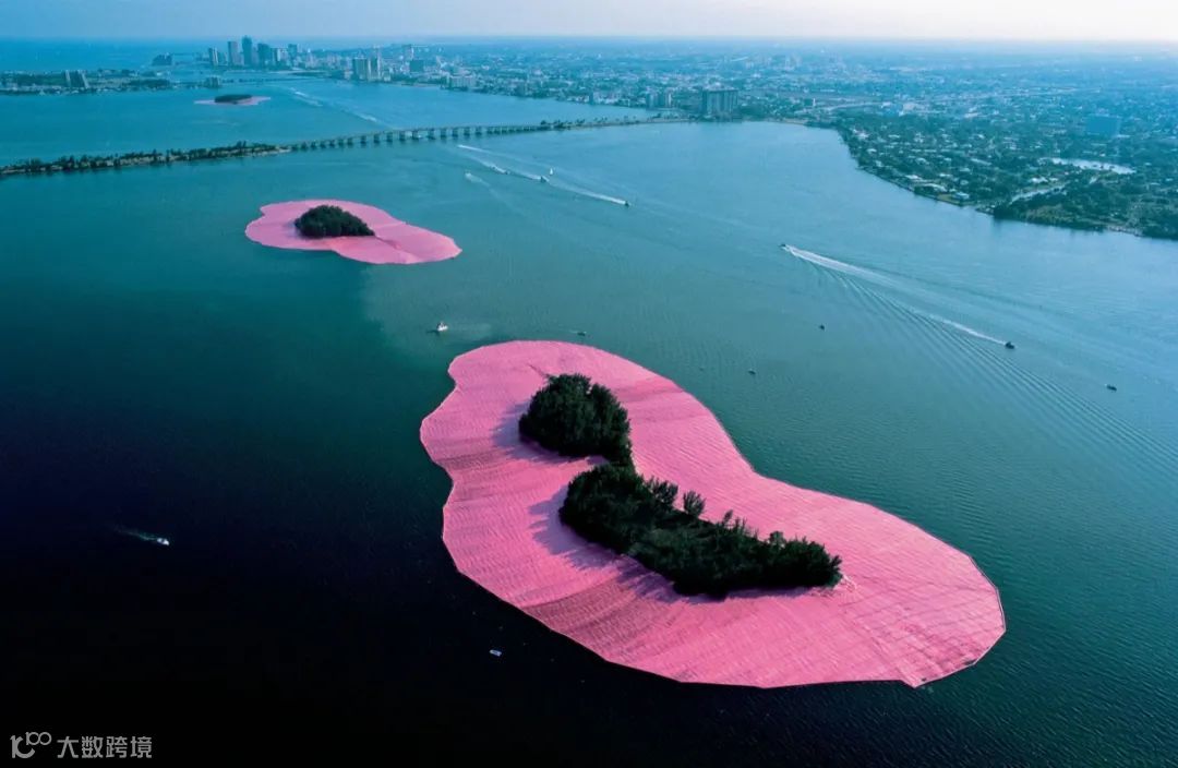 位于美国迈阿密的《被环绕的群岛(1980-83)》(Surrounded Islands)。他们受著名印象派大师莫奈的油画《睡莲》启发,用粉红色的尼龙布把11座小岛围了起来,在碧海蓝天下,犹如11朵硕大的绽放睡莲。