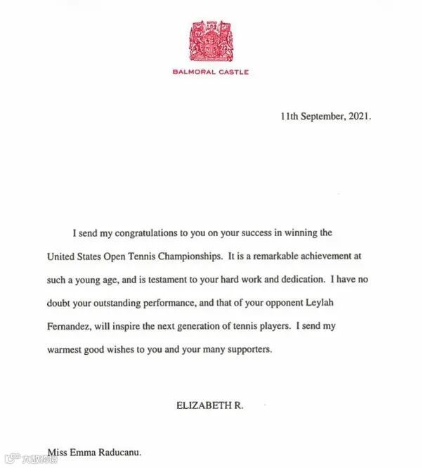 我祝贺你成功赢得美国网球公开赛冠军。在如此年轻的时候就取得了如此非凡的成就,也证明了你辛勤训练和努力奉献。我毫不怀疑你以及你的对手莱拉·费尔南德斯的出色表现,这将激励下一代网球运动员。我向你和你的众多支持者致以最热烈的祝福。