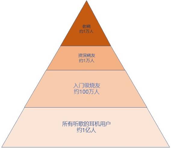 他分享了自己研究出来的耳机用户金字塔:资深“老烧”约1万人,多为圈内人士;第二梯队约十万人,基本都是自己花钱玩的“烧友”;第三梯队是入门级“烧友”,约100万人;此外,中国所有听歌的人均在第四梯队,约1亿人。脑放君说,他希望让第四梯队的人源源不断地进入第三梯队,让更多人体验到HIFI耳机的魅力。