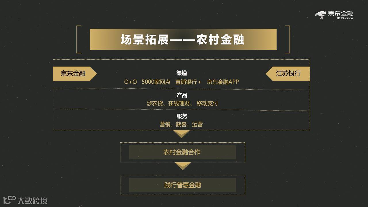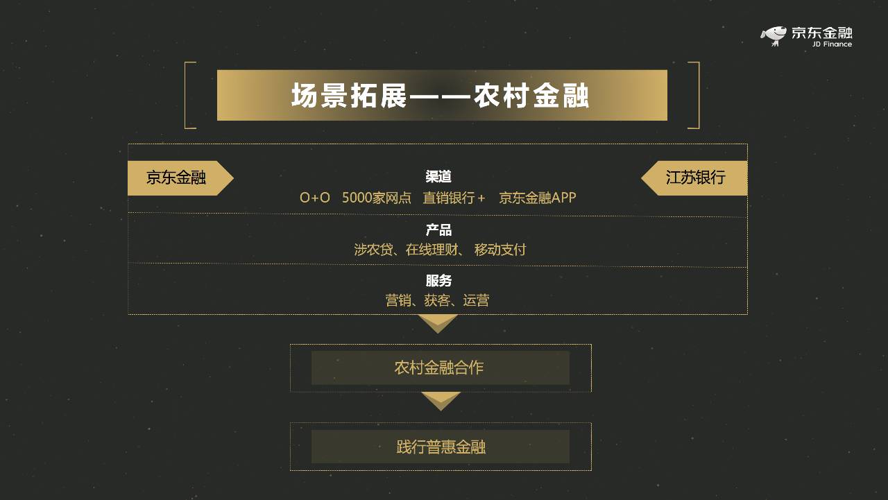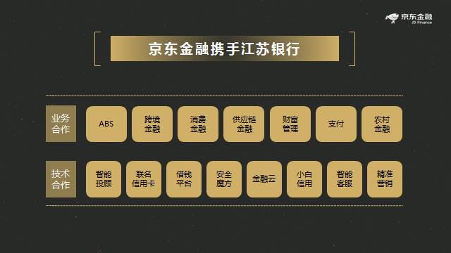 未来,京东金融与江苏银行在消费金融、供应链金融、财富管理、支付、农村金融、跨境金融、资产证券化等多个领域将进行深度合作。例如,京东金融将联合江苏银行在江苏省内5000个合作点为客户提供发卡、理财以及小额信贷等综合服务。