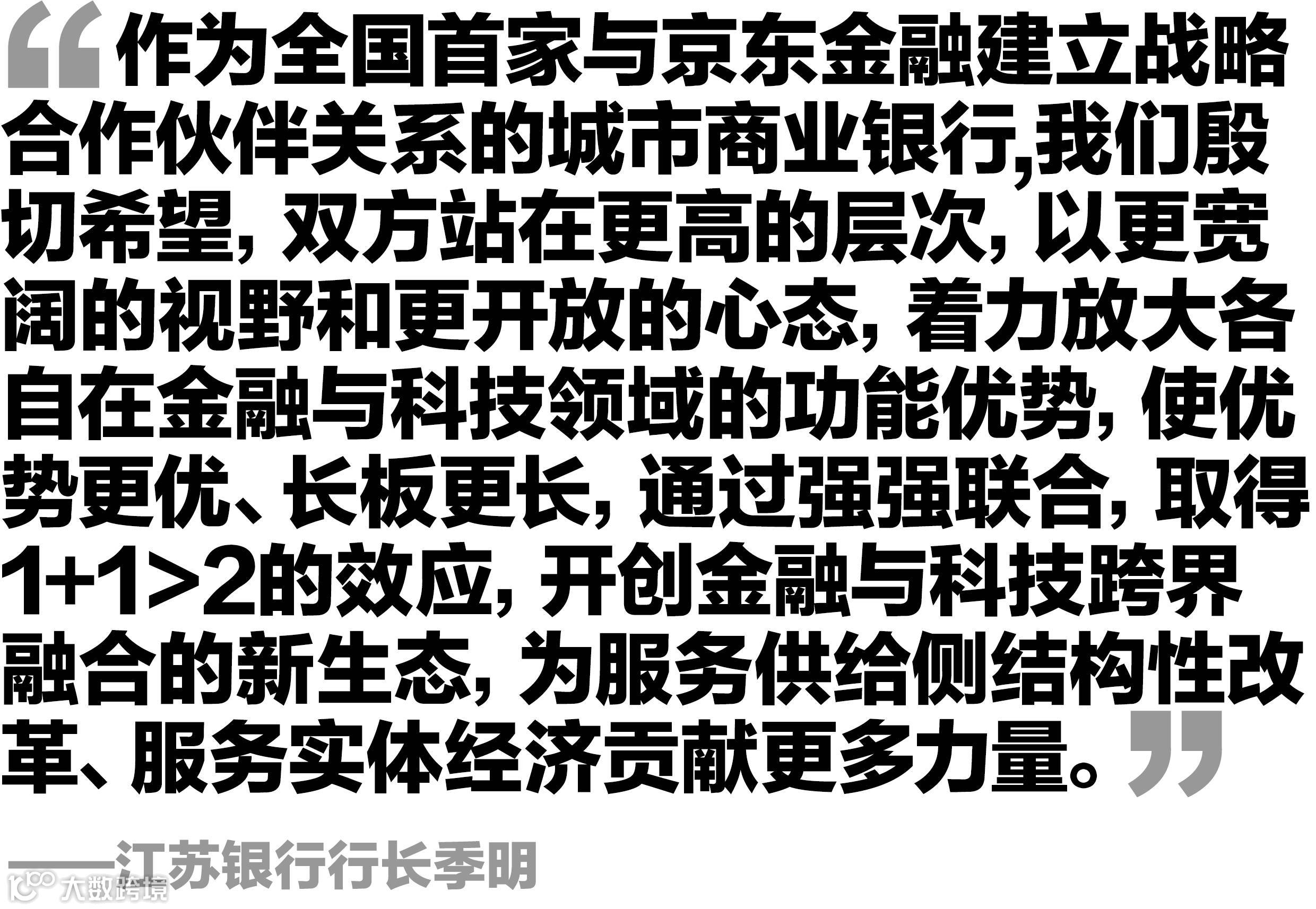 9月28日,京东金融与江苏银行在京举行战略合作签约仪式,这是京东金融首次与城市商业银行达成战略合作。
