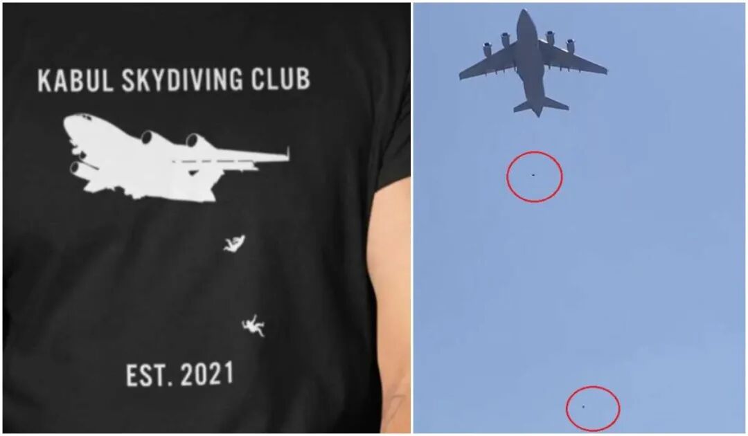 The offensive tee is emblazoned with “Kabul Skydiving Club Est. 2021”. The appalling top also depicts silhouettes of two people plummeting from a military aircraft.