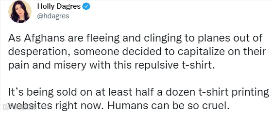 美国智库大西洋理事会研究员、伊朗裔美国人霍莉·达格雷斯在推特上说:“当阿富汗人出于绝望而逃离并紧紧抓住飞机时,有人决定利用他们的痛苦和悲惨来卖钱,设计出这件令人厌恶的T恤……它现在至少在6个印刷T恤网站上出售。人类竟可以如此残忍。”