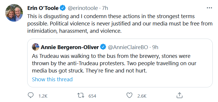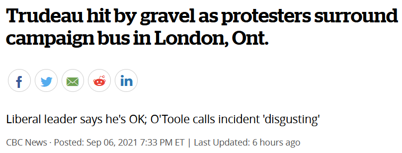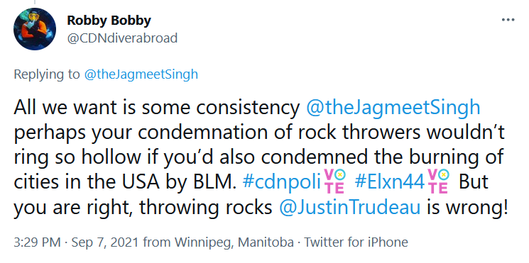 我们想要的只是一致的态度。如果你当时谴责了“黑人的命也是命”抗议活动中焚烧城市的行为,那现在你再来谴责扔石头的人时听起来就不会那么空洞。不过你说的对,向特鲁多扔石头是错误的!