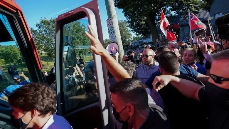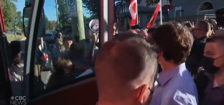As Trudeau went to get on the bus, which was surrounded by angry protesters, small objects could be seen thrown in his direction. A masked Trudeau looked startled before he went into the vehicle.