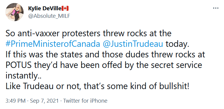 今天,反疫苗接种者的抗议者向加拿大总理投掷石块。如果这是在美国,这些人向总统扔石头,他们会被特勤局立即干掉。