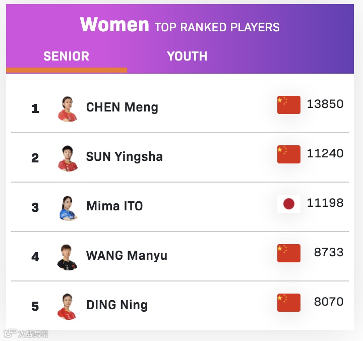 女单方面,21岁的孙颖莎奥运会上以4-0横扫败伊藤美诚,排名也超越后者升至第二,伊藤美诚排位则降至第三。