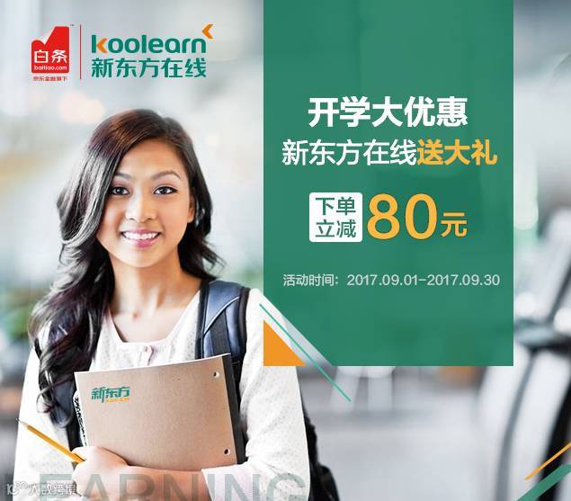爱学习的孩子运气不会太差!京东白条&新东方在线还为你准备了开学大礼包:下单立减80元+全套课程分期付款。也就是说无论你是购买考研班,还是雅思班、托福班、职场班、四六级班的在线课程,除了能在京东优惠价的基础上再减80块,还能分期支付学费,不必一下子就花出去几千块搞得自己很肉疼。享受大礼包的时间是从现在到9月30日止。