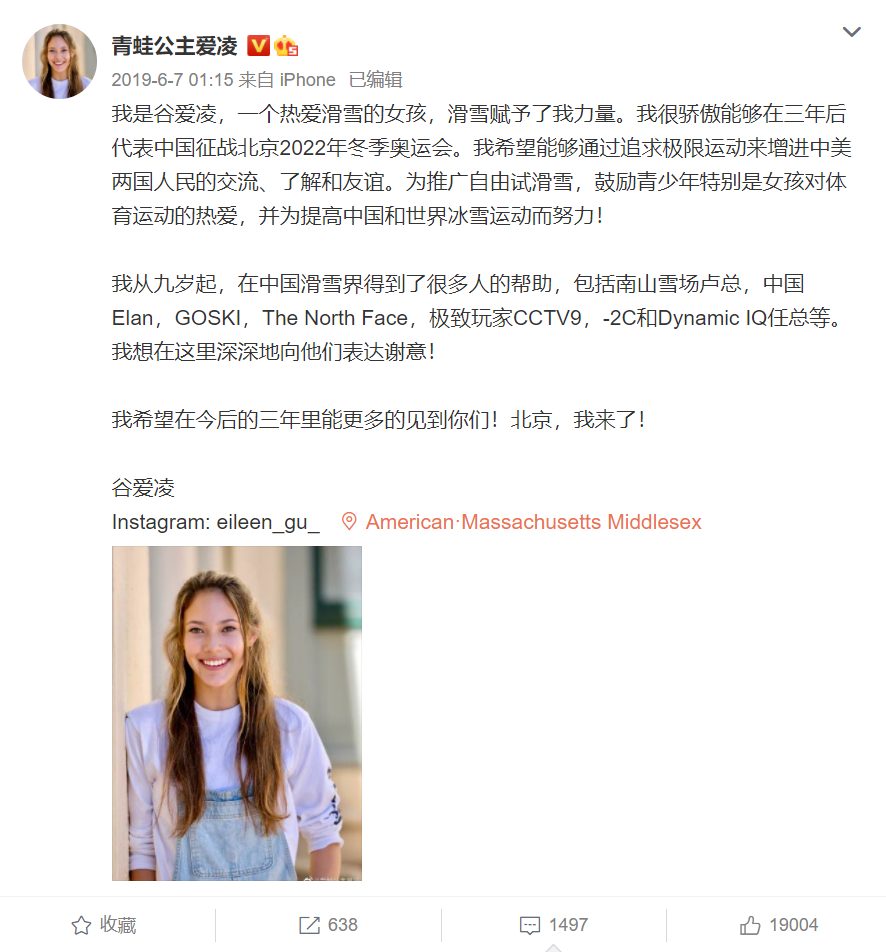 2019年6月7日,谷爱凌公布了人生中一个非常重要的决定。在个人社交媒体上,她宣布自己正式转为中国国籍,并将代表中国征战北京2022年冬季奥运会。也正是从那个时候开始,谷爱凌逐渐走入了中国民众的视野。